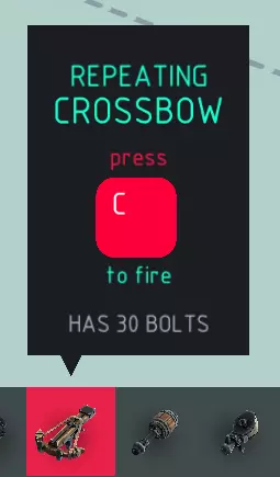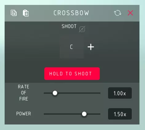 十字弩射击: > 发射十字弩。 按住射击: > 切换是否可以按住控制键以射速自动发射十字弩。 射速: > 发射十字弩箭矢之间的等待时间。 威力: > 十字弩发射时的力量和速度。