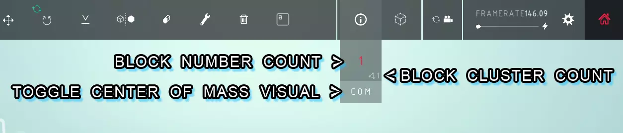 方块数量统计: > 这是你机器中放置的方块总数,该数字也包含核心方块。 方块集群数量: > 这是你机器中的集群总数。集群是游戏自动分配组合在一起的方块组。游戏这样做有多个原因,但主要是为了提升性能。你可以通过主屏幕设置菜单中的【集群】视觉工具查看这些集群。 切换质心视觉显示: > 此按钮用于切换显示机器质心的视觉标记。该工具有助于保持物体的平衡或配重。请注意,这是所有已构建方块的质心,因此如果你在一个机器中有多个组件,它们不会被视为单独个体。对称工具 > 对称工具会复制你放置的方块到你可以移动的对称点的另一侧。点击X、Y、Z按钮可更改方块复制所沿的平面。点击带有圆圈的较大方形按钮,可将对称点重新定位到另一个方块上。听起来复杂,其实不然。