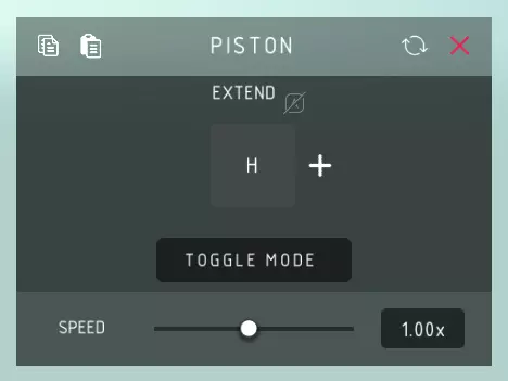 活塞 伸展: > 伸展活塞。 收缩: > 收缩活塞。 切换模式: > 在收缩和伸展状态之间切换活塞。 速度: > 活塞伸展和收缩的速度与力度。