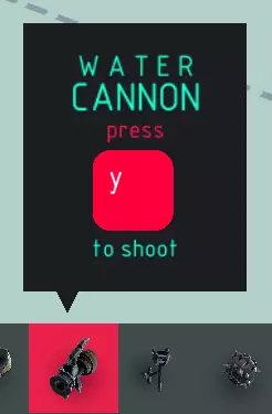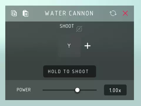 水炮射击: > 喷射水流。 长按射击: > 按住控制键进行射击,或通过控制键切换水炮的开启与关闭状态的功能。 威力: > 水炮推开物体的力量,以及水流的喷射距离。