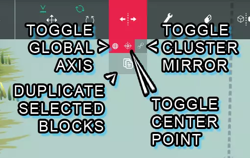 切换全局轴: > 形似带网格圆圈的按钮可切换镜像工具在使用局部轴和全局轴之间的模式。 复制所选方块: > 底部形似两张纸/文件的按钮可复制所选方块。复制出的方块会生成在与原方块相同的位置,因此复制后需要移动它们。 切换集群镜像: > 形似链条的按钮可切换镜像工具以对集群中的方块进行镜像,集群可通过快速设置下的集群按钮查看。 切换中心点: > 形似十字准星的按钮可切换镜像工具,使其从方块的中心而非附着点进行镜像。