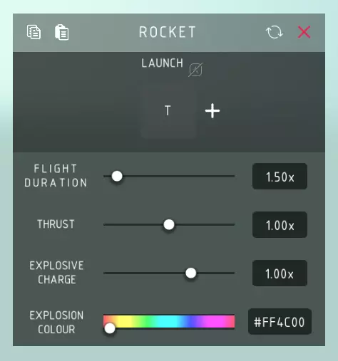 火箭发射: > 发射火箭。 飞行持续时间: > 火箭发射后到爆炸前的活跃时长。 推力: > 火箭发射时的力量和速度大小。 爆炸威力: > 爆炸的范围和伤害程度。 爆炸颜色: > 爆炸的颜色。