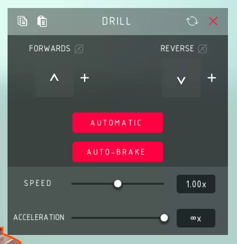 钻头 正向: > 使钻头正向旋转,在编辑器模式中由箭头指示。 反向: > 使钻头反向旋转,在编辑器模式中由箭头指示。 自动: > 使钻头自动旋转。默认情况下处于开启状态。 自动制动: > 当控制键被释放时,自动将钻头速度降至0。 速度: > 钻头旋转的速度和力度。 加速度: > 钻头达到最大速度的快慢程度。