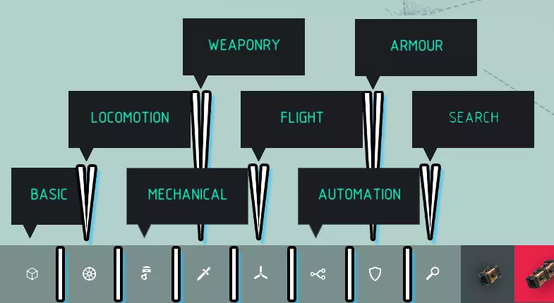 切换工具提示: > 文本气泡按钮用于切换所有工具提示。工具提示是鼠标悬停在菜单项上时出现的文本气泡。建议始终保持开启状态。 切换音乐: > 音符按钮用于切换游戏内音乐。 切换平滑相机: > 相机绘制按钮用于切换游戏相机的平滑模式。平滑相机模式通过添加加速度来平滑相机移动,使相机在开始和结束移动时会随时间加速和减速。 切换高级建造: > 绘图罗盘按钮用于启用高级建造模式。此模式在高级建造部分有详细说明。 快速设置: > 【设置】和【视觉效果】分组包含了更易访问的游戏设置。【阴影】按钮用于切换所有阴影效果。【泛光】按钮用于开关全局泛光效果。泛光的作用是通过调整屏幕显示效果,让明亮物体呈现出更自然的亮度。 【屏幕空间环境光遮蔽(SSAO)】按钮用于开关全局屏幕空间环境光遮蔽效果。SSAO的作用是在物体表面添加细微阴影,增强物体的立体感和真实感。 【快速近似抗锯齿(FXAA)】按钮用于开关全局快速近似抗锯齿效果。FXAA的作用是平滑处理物体斜向边缘处出现的锯齿状像素。 【暗角】按钮用于开关屏幕暗角效果。暗角是指在整个屏幕边缘及角落形成的深色渐变线条。 【景深(DOF)】按钮用于开关相机景深效果。景深效果会在相机聚焦于近处物体时,使远处物体呈现模糊状态。“血液”按钮用于切换生物产生的血液效果。 “集群”按钮用于切换集群视觉效果。集群视觉效果会将所有方块按各自的集群进行着色。集群相关内容在机制部分有介绍。 “皮肤”按钮用于切换所有方块的皮肤。本指南不会介绍皮肤,但简单来说,皮肤可以改变方块的外观和形状。 菜单:机器编辑器(续) (检查菜单有其独立部分。) 神力: > “神力”组包含能改变游戏运行方式的特殊能力。使用任何神力都会使你无法完成任何关卡。 盾牌按钮用于切换机器无敌状态。顾名思义,它能让你的机器坚不可摧。 三发子弹按钮用于切换无限弹药。这意味着所有有弹药限制的武器现在都拥有无限弹药。 【零重力】按钮可切换零重力模式,这会禁用关卡中的所有重力。 【爆炸物等级标志】按钮可切换爆炸炮弹模式,这会使所有炮弹都具有爆炸性。 【火焰】按钮可切换点击燃烧功能,这意味着在游戏过程中,你可以通过鼠标点击在任意位置制造火焰。 【手指光标】按钮可切换鼠标拖拽功能,这意味着在游戏过程中,你可以通过点击并拖动鼠标来拉动物体。 统计数据