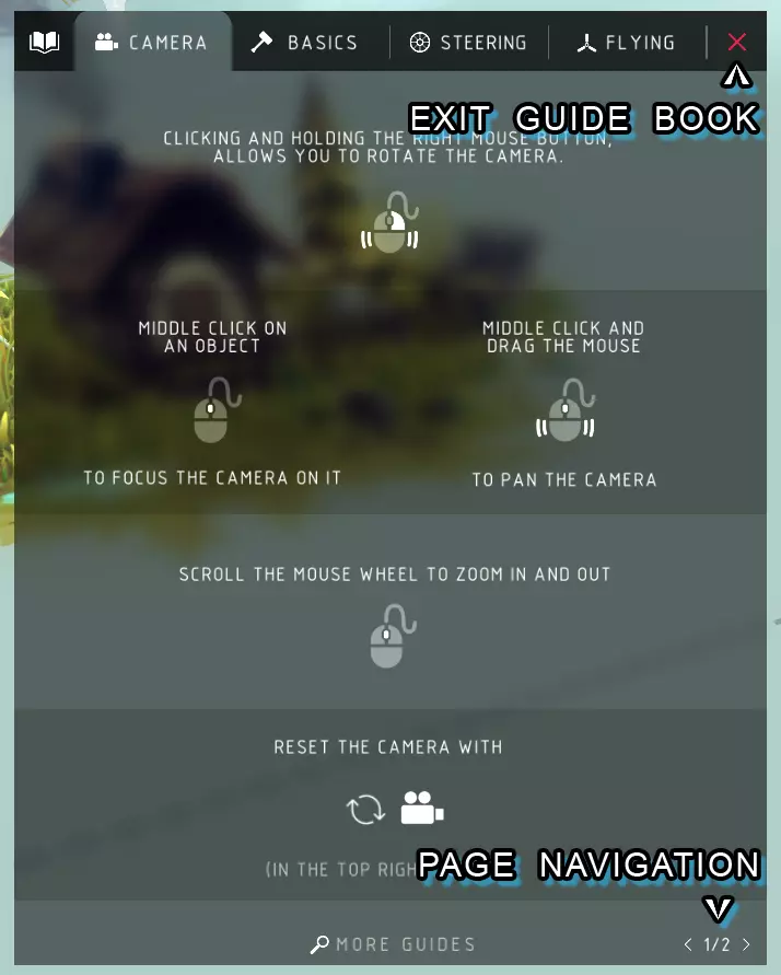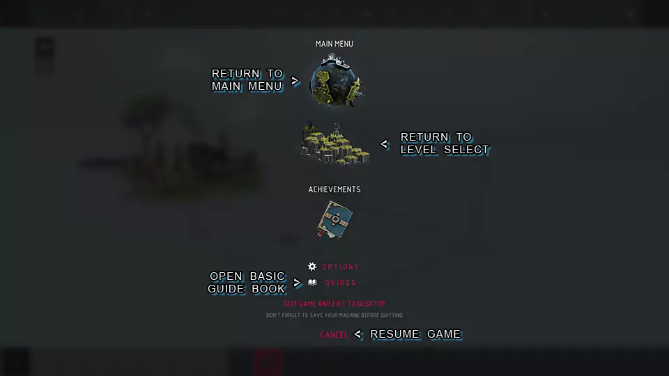 返回主菜单: > 点击星球即可返回主菜单。 返回关卡选择: > 点击区域即可返回关卡选择。 打开基础指南手册: > 【指南】按钮会打开一个包含部分基础建造指南的游戏内菜单。