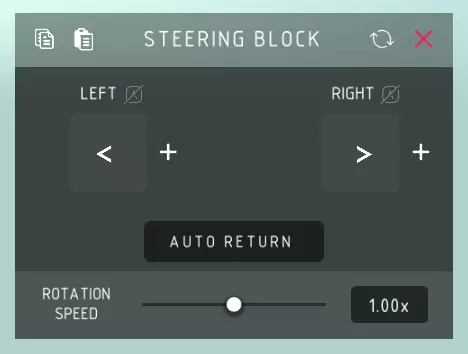 转向方块 向左: > 使转向方块向左转动,编辑时顶部箭头会指示方向。箭头指向的方向为左。 向右: > 使转向方块向右转动,编辑时顶部箭头会指示方向。与箭头指向相反的方向为右。 自动回位: > 控制键松开后,转向方块自动回到初始位置。 旋转速度: > 转向方块转动的速度。