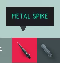 名称 金属尖刺 尺寸 0.5x0.5x0.25 可破坏? 否 易燃? 否 【金属尖刺】适用于戳刺物体。其尖端在施加足够力量时会造成伤害。