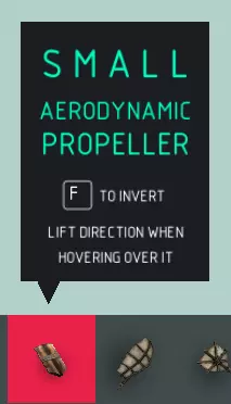 名称 小型气动螺旋桨 尺寸 2x1x0.33 可破坏? 否 易燃? 是 小型气动螺旋桨是气动螺旋桨的缩短版本。当它相对于螺旋桨向前移动时会产生升力。如果侧向旋转,它将更像一个螺旋桨,驱动机器前进。作为两者中较小的螺旋桨,它更适合作为旋转螺旋桨使用,而非提供向上的升力。