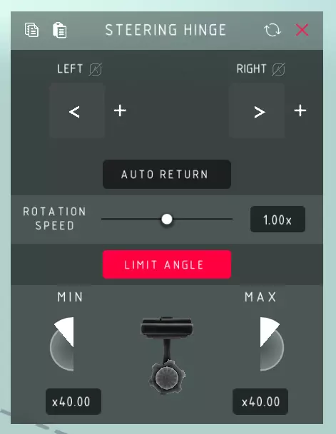 转向铰链 向左: > 使铰链向左转动,编辑时由顶部箭头指示。箭头指向的方向为左。 向右: > 使铰链向右转动,编辑时由顶部箭头指示。箭头指向的方向为右。 自动回位: > 控制键停用后,铰链自动返回起始位置。 旋转速度: > 铰链转动的速度。 限制角度: > 允许你限制铰链在停止前的转动幅度,防止铰链过度旋转并撞到与其相连的方块而造成损坏。 最小值: > 铰链向左转动并停止前的最大角度(以度为单位)。Max:铰链在自行停止前可向右转动的最大角度(以度为单位)。