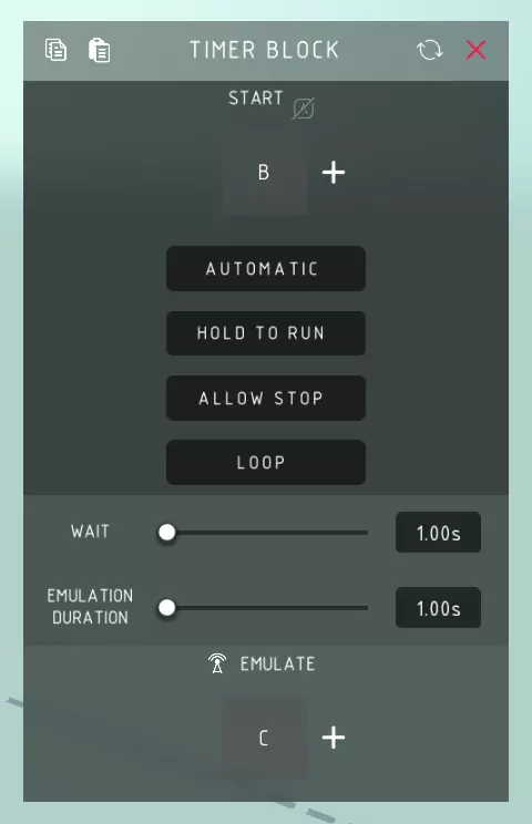 计时器模块 启动: > 启动计时器。 自动启动: > 进入游戏模式时自动启动计时器。 按住运行: > 将计时器更改为仅在按住控制键时倒计时。 允许停止: > 将控制键更改为切换计时器的开启和关闭。默认情况下,在计时器结束前多次按下控制键只会重置计时器。 循环: > 将计时器更改为在结束后自动重复。 等待时间: > 计时器的时长。 模拟持续时间: > 模拟按键被“按住”的时长。 模拟: > 模拟按键操作,相当于为你按下控制键。