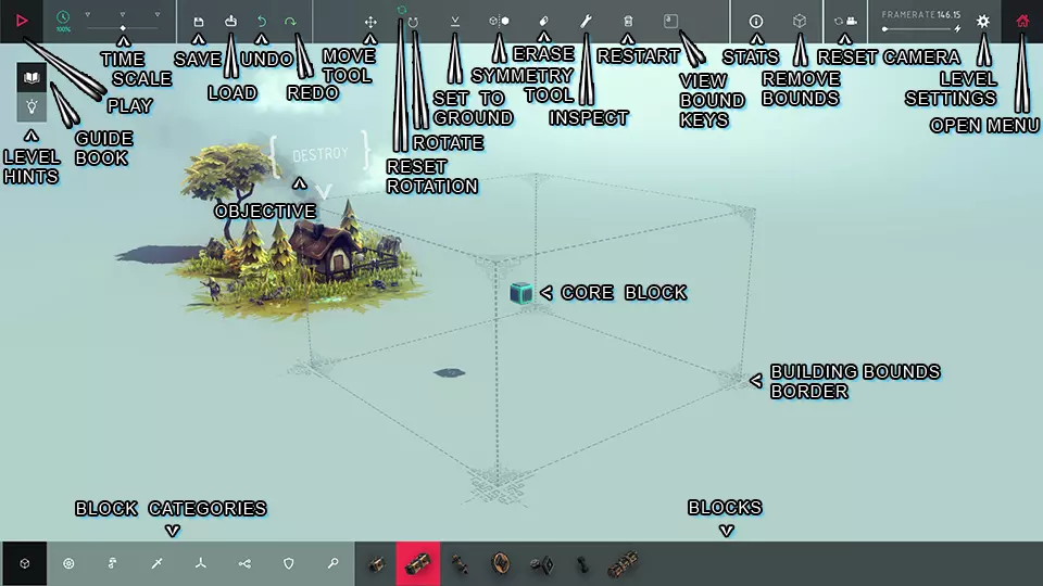 关卡提示: 点击灯泡图标会打开一个小菜单,其中包含当前关卡的特定提示。这些提示仅在部分关卡中存在。 指南手册: 点击打开的书本图标会打开一个中等大小的菜单,里面有各种基础建造技巧和说明。该手册在所有关卡中都可使用,且不针对特定关卡。请注意,手册内的说明仅为入门指导,并非硬性规定,你可以自由尝试和修改设计。 开始游戏: 左上角的横向三角形图标用于开始关卡,启用物理效果、敌人和关卡功能。在游戏过程中,点击同一位置可停止关卡。你也可以按空格键来开始和停止关卡。 时间速度: 此滑块用于控制游戏的运行速度。你可以左右拖动直线上的白点来降低或提高速度。也可以点击直线上方的箭头跳转到特定速度,其中左侧箭头为0%,中间箭头为100%,右侧箭头为200%。如果调整图形设置后仍遇到卡顿,请降低游戏速度。 保存: > 软盘形状的按钮会打开保存菜单,你可以在此保存当前机器以便日后使用或分享。该菜单可在菜单部分找到。 加载: > 带有箭头的文件夹形状按钮会打开加载菜单,你可以在此将保存的机器加载到当前关卡中。该菜单可在菜单部分找到。撤销: > 蓝色向上后方弯曲箭头形状的按钮可撤销您之前的操作。 重做: > 绿色向右下方弯曲箭头形状的按钮可重做您已用撤销按钮撤销的操作。 移动工具: > 四箭头交叉图标是移动工具。它允许您沿X、Y和Z轴移动您的机器。此工具将在下文进一步详细说明。 旋转: > 圆形双箭头图标是旋转工具。它允许您沿X、Y和Z轴旋转您的机器。此工具将在下文进一步详细说明。 重置旋转: > 旋转工具左上方的蓝色双箭头圆形图标可将您机器的旋转重置为其原始旋转状态。设置为地面: 箭头指向一条线的图标可将你的机械放置到地面上。 对称工具: 线两侧有两个立方体图案的是对称工具。它会复制你建造的所有内容,使其相对于中心点在选定平面上对称。有关图片和进一步说明,请参阅机械编辑器第二部分。 删除: 橡皮擦工具允许你点击方块进行删除。你也可以在不使用删除工具的情况下,按“x”键删除方块。 检查: 扳手工具允许你检查并更改方块的详细信息和控制设置。此工具的详细说明如下。 重新开始: 垃圾桶图标会删除所有方块,并将核心方块重置到默认位置和旋转角度。查看绑定按键: > 键盘按键会打开一个中等大小的滚动菜单,其中列出了您机器中正在使用的所有键盘按键以及各按键的功能。当您使用Steam社区中的机器且不了解其控制方式时,此功能非常有帮助。 统计信息: > 圆形中的“i”图标会打开一个小菜单,详细显示您机器的方块数量、集群数量和质心。下文将进一步探讨此内容。 移除边界: > 立方体轮廓图标会移除建造边界,允许您建造大型机器。请注意,启用此功能后您将无法完成关卡,因此它仅在关卡进度之外有用。 重置相机: > 带有双箭头圆圈的相机图标会将您的相机重置到默认位置。关卡设置: > 齿轮图标会打开一个包含各种关卡设置的中等大小菜单。下文将对此进行介绍。 打开菜单: > 房屋图标会打开暂停菜单。该菜单可在菜单部分找到。 方块分类: > 浅色背景的图标是分类,用于将所有方块按类型分组。点击图标将只显示该分类下的方块。 方块: > 深色背景的图片是单个方块。点击图片会选择该方块,并允许你无限放置它。每个方块的详细信息在方块部分说明。 核心方块: > 建筑边界中心的蓝灰色方块是核心方块。该方块作为你机器的起点和公共中心。在方块部分有详细说明。 建筑边界线: > 虚线和带细节的边角构成的长方体轮廓表示你的建筑区域。不使用“移除边界”按钮的话,你无法在这些边界外建造。请注意,使用此按钮将使你无法完成关卡。 主屏幕设置