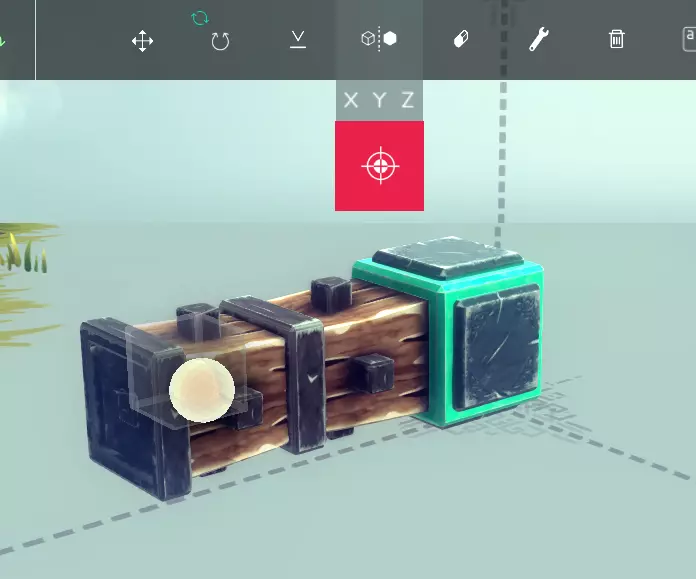 【全局轴开启状态下的方块A】 【全局轴开启状态下的方块B】 移动工具可让你沿3个不同轴直线移动单个或多个方块,也能在平面上移动单个或多个方块。 > 只需点击并拖动箭头即可直线移动单个或多个方块。你也可以点击并拖动中心的方块来沿该平面移动单个或多个方块。点击其他箭头下方的黑/灰色箭头可将机械放置在地面上。 旋转工具