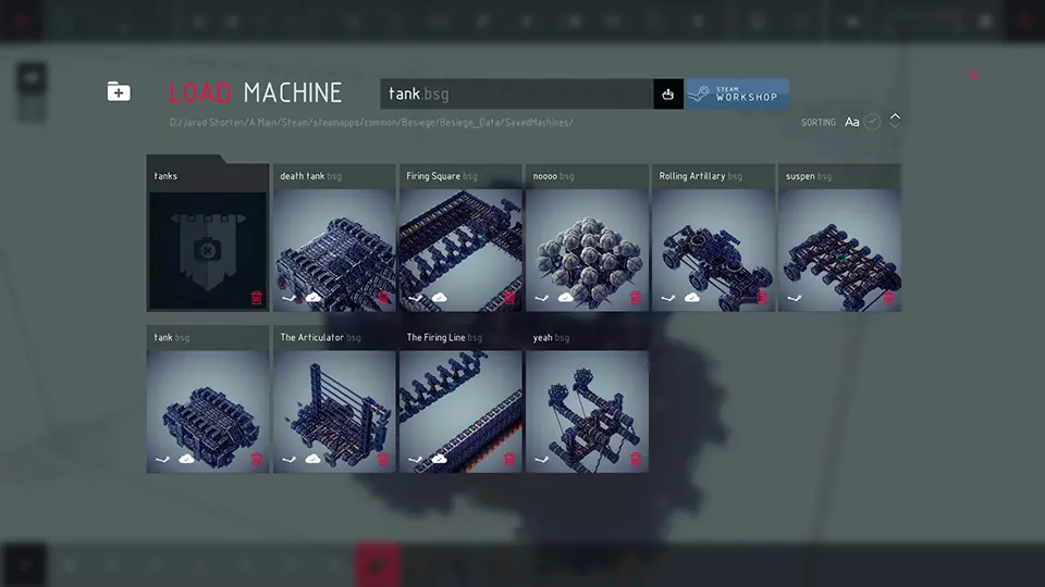 文件夹名称输入: > 在此文本框中输入您想要创建的文件夹名称。当您加载位于文件夹内的机械时,需要通过此名称查找。只有进入文件夹后,其中的机械才会显示。这也是游戏文件中用于区分不同机械的文件夹名称。 保存/创建文件夹: > 使用此带有软盘图标的按钮来保存/创建新文件夹。 加载菜单