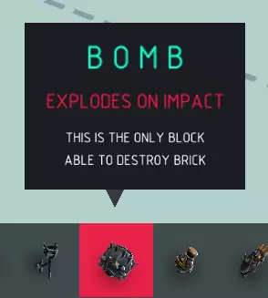 名称 炸弹 尺寸 2x2x2 可破坏? 爆炸物 易燃? 可加热 炸弹是一种高爆炸性炸弹,撞击时会引爆。无论是否爆炸,它都会点燃周围物体。最适用于摧毁建筑和大型实体集群。但它比其他武器更难使用。由于其爆炸和火焰威力,必须将其投掷、发射或滚离你的主机器(当然,除非这是自杀任务)。炸弹在受热时也会引爆。