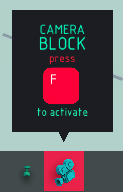 名称 相机方块 大小 不适用 可破坏? 否 可燃? 否 > 相机方块与销钉方块类似,它并非真正的方块,在游戏空间中并不实际存在。它的作用是作为可自定义的相机角度,你可以将其附着在某个方块上,或让它悬浮在空中。你可以同时设置多个相机方块,并通过它们的控制键在这些方块之间切换。这是默认相机物理效果的一个不错替代方案。