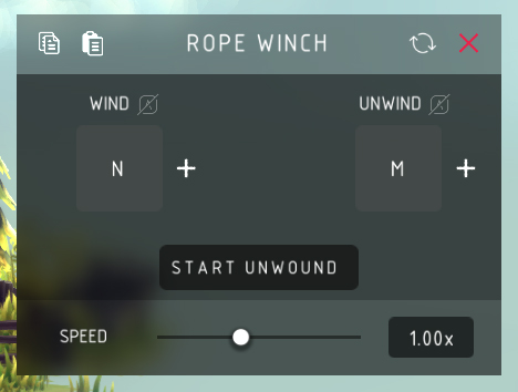 绳索绞盘 收绳: > 卷起绳索,缩短其长度。 放绳: > 松开绳索,延长其长度。 初始放绳状态: > 允许绳索在游戏模式开始时处于最大长度。 速度: > 绳索收放的速度和力度。