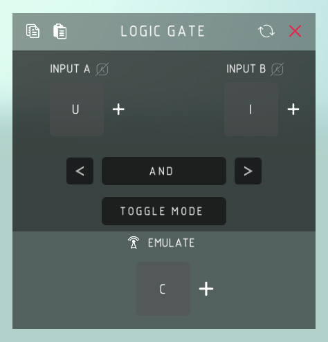 逻辑门 输入A: > 控制键A。 输入B: > 控制键B。 逻辑选项: 与门: > 当同时检测到A和B时激活。 或门: > 当检测到A或B时激活。 或非门: > 当既未检测到A也未检测到B时激活。 与非门: > 与“与门”相反,当既未检测到A也未检测到B,或仅检测到A或仅检测到B时激活,当同时检测到A和B时不激活。 异或门: > 也称为“互斥或”,当仅检测到A或仅检测到B时激活。 同或门: > 当既未检测到A也未检测到B,或同时检测到A和B时激活。非: > 唯一使用单个控制键的逻辑选项,当未检测到控制键时激活。 切换模式: > 将逻辑门更改为切换模拟键的开和关,而不是仅在逻辑选项激活时开启。 模拟: > 模拟按键操作,相当于为你按下控制键。