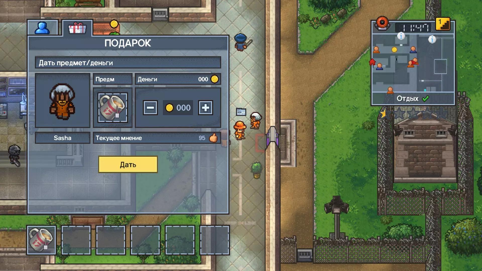 来,宝贝!给我们倒杯喝的! 为另一名囚犯或警卫准备一杯茶并递给他。 在箱子里找到:一块糖、一个杯子(看起来像马克杯)、一个茶包,制作一杯茶,然后把它交给警卫或囚犯。