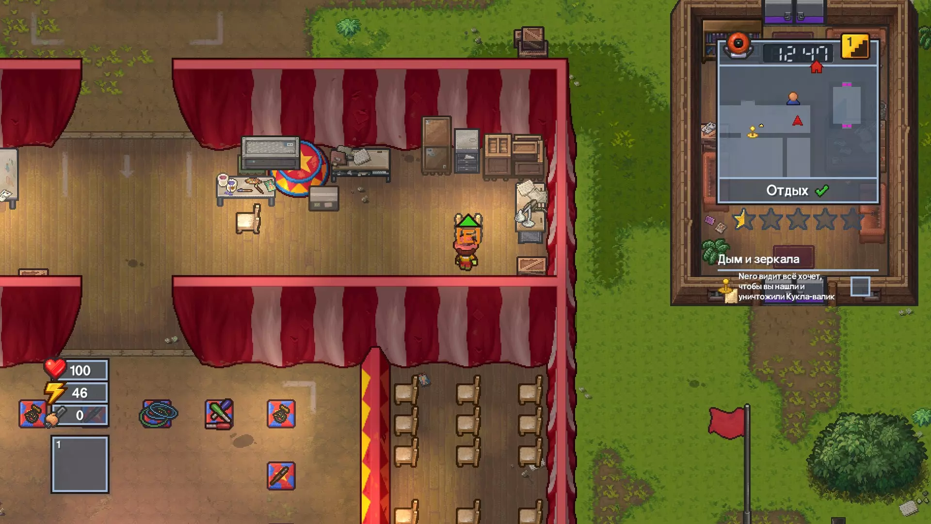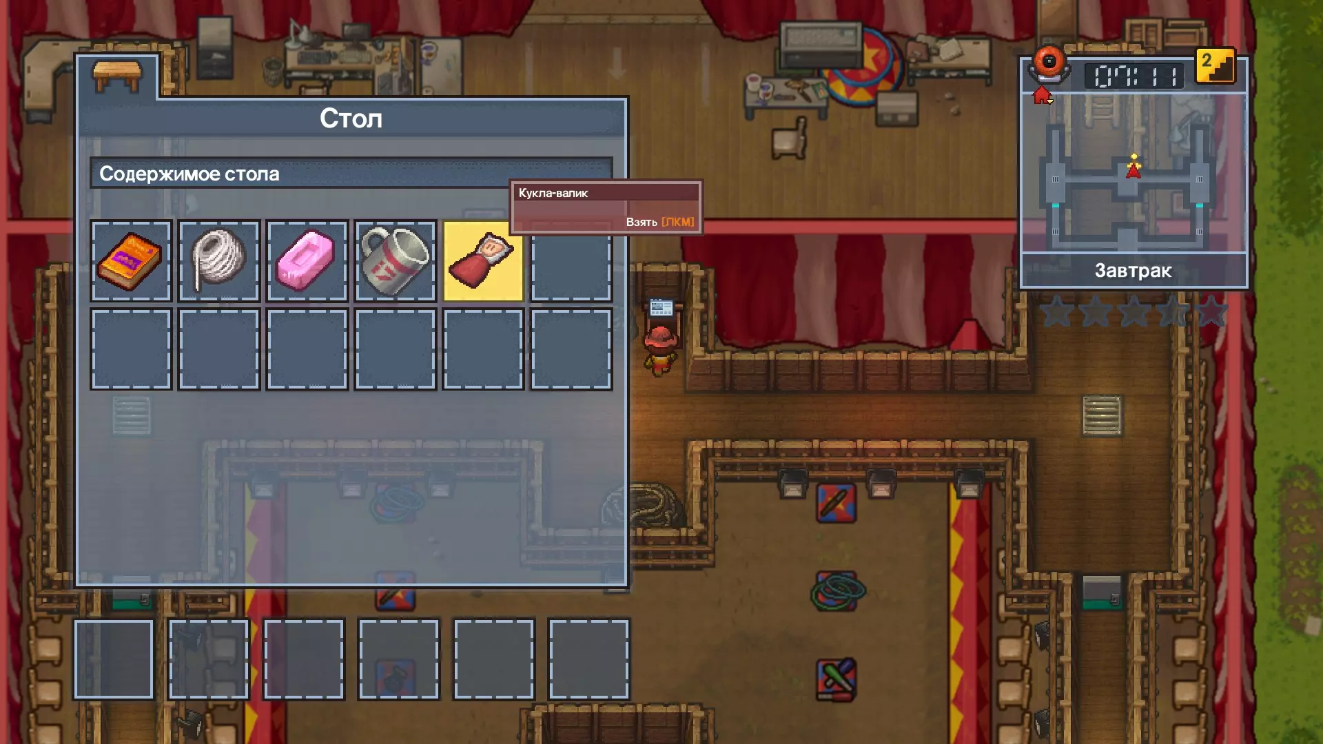1 借用 - 拿起舞台上方的布娃娃,然后把它扔进厕所。