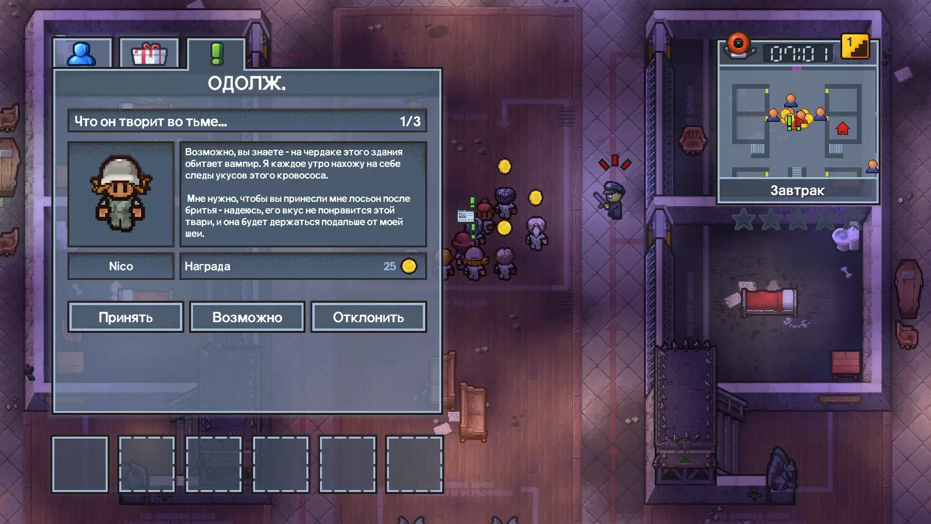 几乎被幽灵掌控 完成任务【夜间冲突】 任务【夜间冲突】会由任意囚犯随机发布,因此在该任务出现前,请拒绝所有其他任务。