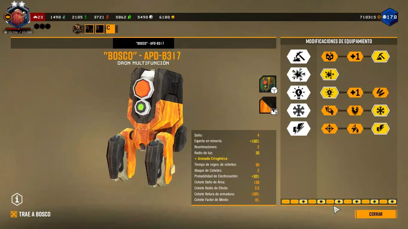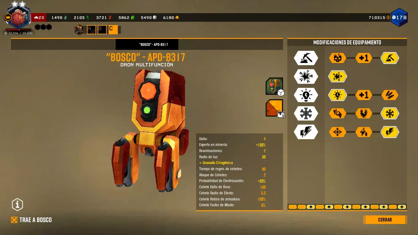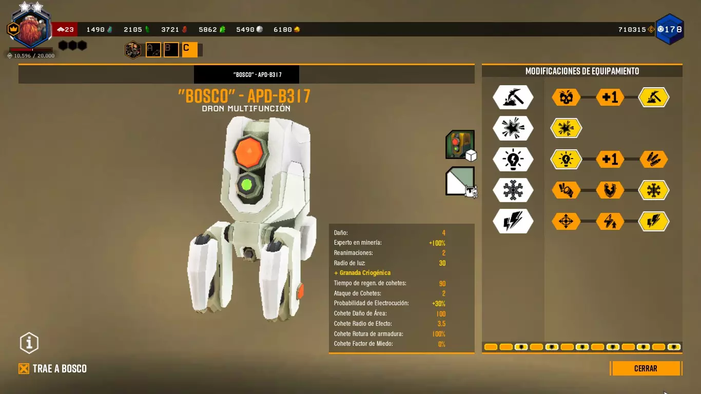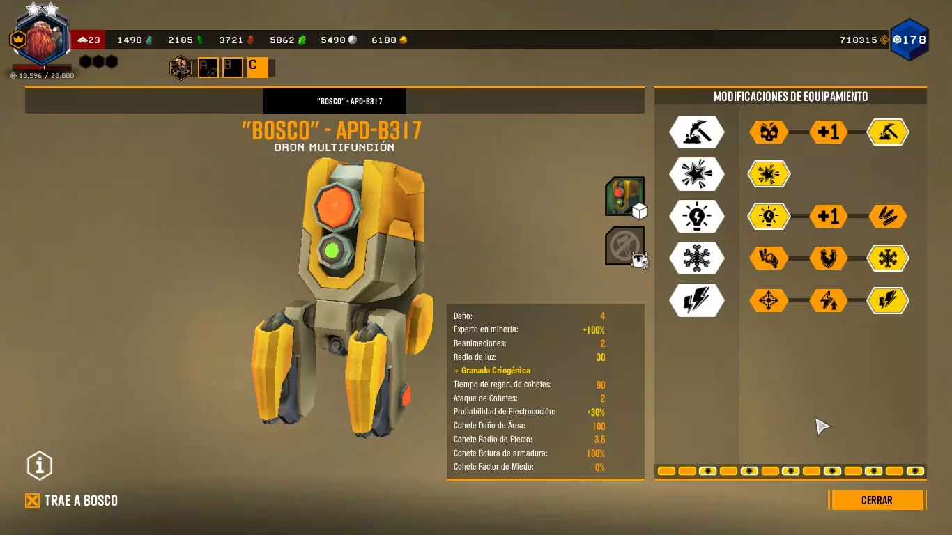 这样做时,它会向任何敌人或我们指定的目标射击,并且会出现一个红色拳头形状的图标。 博斯科能够与任何敌人战斗。你甚至可以命令它攻击特定的敌人。 通过改装,博斯科可以发射火箭、使子弹带电、破坏护甲、冻结等等。(终结者之石) ========================================================================= 采矿
