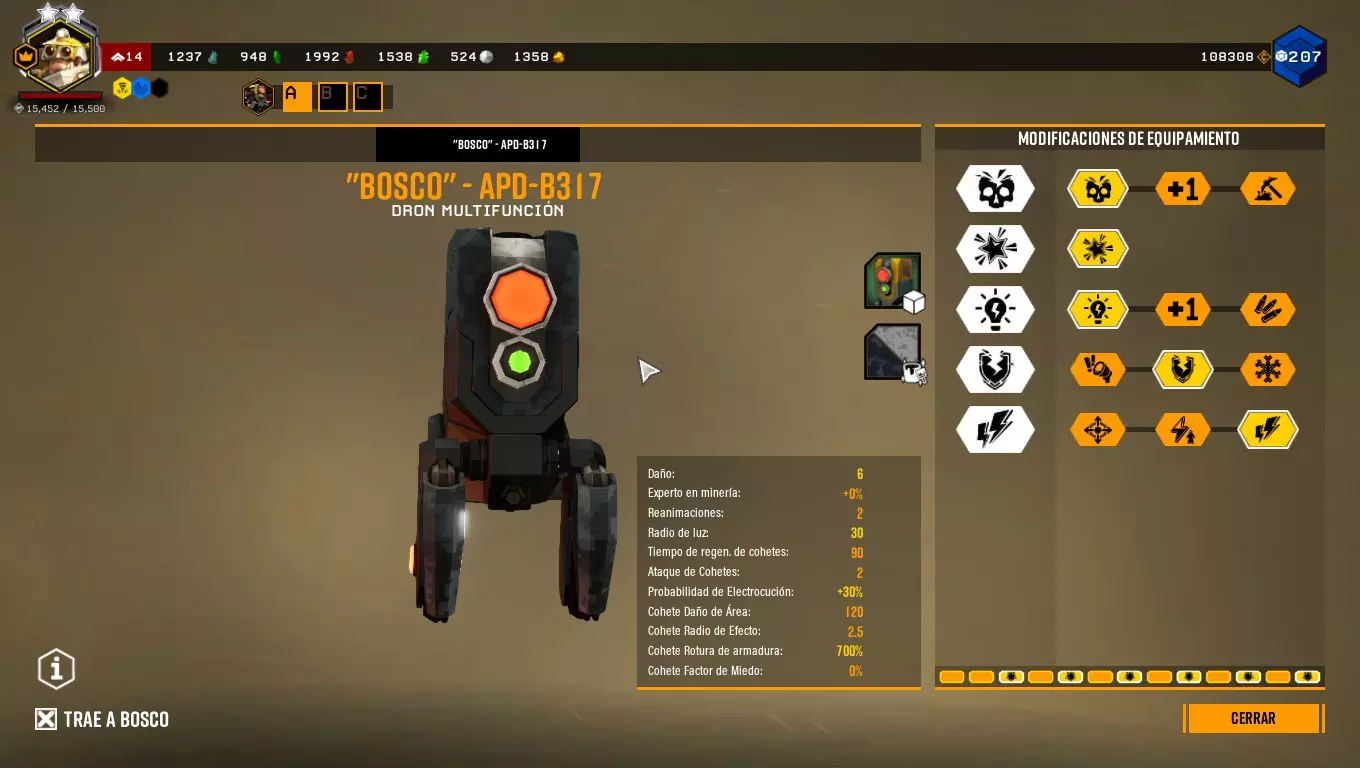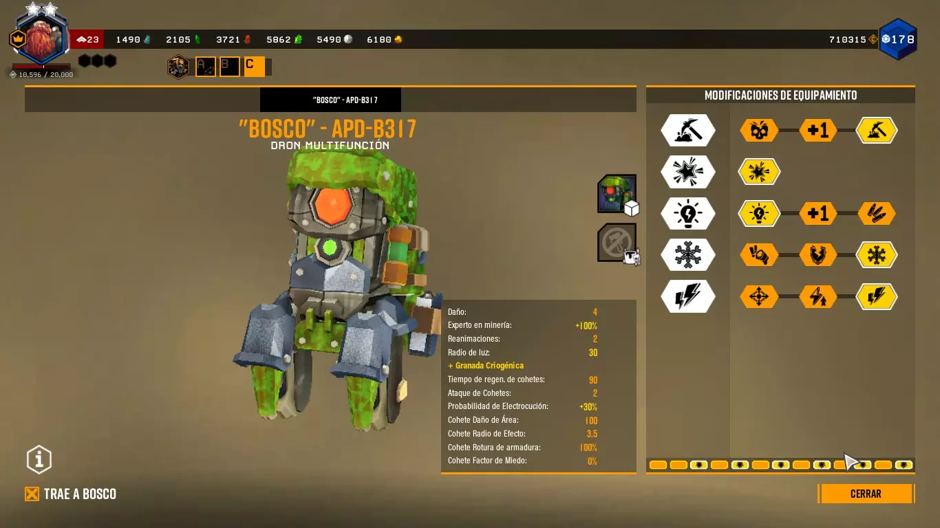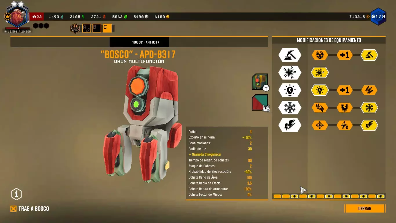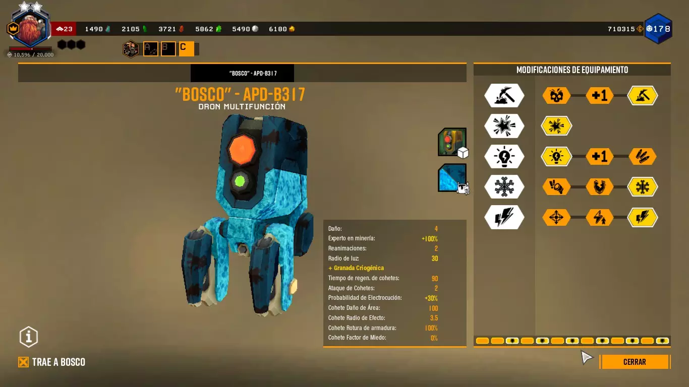 这样做时,它会向任何敌人或我们指定的目标射击,并且会出现一个红色拳头形状的图标。 博斯科能够与任何敌人战斗。你甚至可以命令它攻击特定的敌人。 通过改装,博斯科可以发射火箭、使子弹带电、破坏护甲、冻结等等。(终结者之石) ========================================================================= 采矿