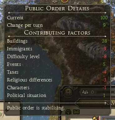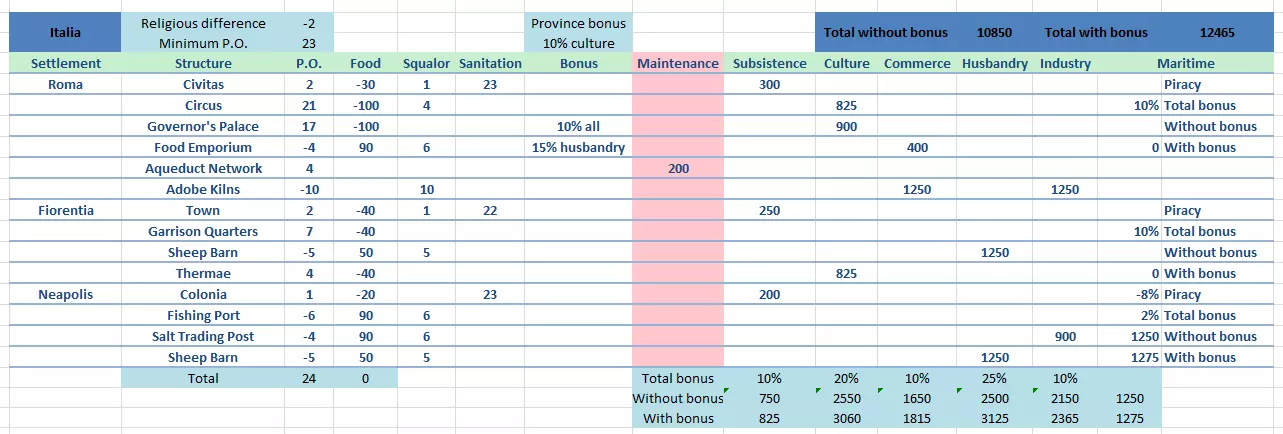 【宗教差异减少?太棒了!】 10. 每个省份的最低公共秩序要求 = 21 - 宗教差异。例如,意大利的宗教差异为-2,因此最低公共秩序 = 21 - (-2) = 23。 11. 希腊-罗马多神教为每个定居点提供+2卫生加成。查看模板上的“卫生”列时,必须为每个定居点额外加上+2才能得到最终的卫生值。 12. 建筑维护费不包含在“含加成总计”中,因为在游戏里,维护费不计入省份财富的计算。维护费会从派系总财富中单独扣除。