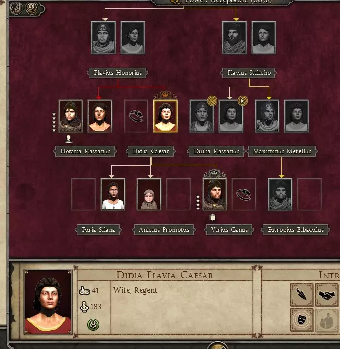 【是否刺杀霍诺留,这是个问题】 不过,有个规避方法,步骤如下: 1. 给你的皇帝找一位妻子。 2. 不要宣布王位继承人。 3. 通过刺杀或让皇帝英勇地冲向敌人进行自杀式攻击,使皇帝死亡。 4. 皇帝的妻子将成为摄政者。 5. 由于女性角色无法获得特质,你可以随心所欲地摧毁定居点和处决俘虏,而不必担心特质问题。
