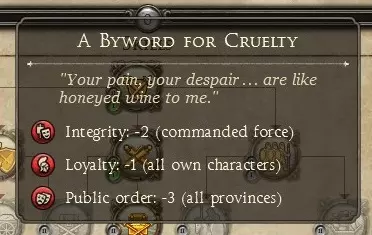有很多公共秩序惩罚需要应对。你的政治权力会影响派系范围内的公共秩序,但由于这在游戏过程中会不断波动,本指南将忽略政治的影响。此外,你的皇帝可能会获得“严厉”特性,这会带来-1的派系范围公共秩序惩罚。如果不加以控制,“严厉”特性最终会恶化为“残酷的代名词”特性,带来-3的公共秩序惩罚。像摧毁定居点、处决人质等“严厉”行为似乎会触发该特性。由于在西罗马帝国的游戏中,摧毁定居点在某种程度上是不可避免的,因此要避免你的皇帝获得“严厉”特性即使并非完全不可能,也是极其困难的。