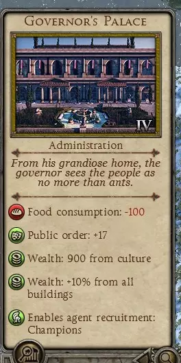 《王国风云》省份设计基本原则 1. 通常来说,一个省份拥有的港口数量越多,其收入潜力就越大。这是因为渔港(-6公共秩序/+90食物产量)比牛场(-5公共秩序/+70食物产量)或羊圈(-5公共秩序/50食物产量)能产出更多食物。如果食物充足,你甚至可以将其中一个港口改建为贸易港以获取更高收入。拥有3个港口的省份(例如:大希腊、西海岛)会成为你最富有的省份之一。而没有港口的省份(例如:比利时高卢)则会是你最贫穷的省份。 2省份内可获取的资源类型会影响其收入。葡萄酒和橄榄是最佳资源,毛皮和盐也很不错。不同资源将在本指南系列的第六部分中讨论。 3. 省份内港口和资源的具体位置也很重要。通常来说,如果港口和资源**不位于省份首府**,模板设计会更简单。此外,**港口和资源最好分布在两个不同的定居点,而不是集中在一个地方**。 4. 每个省份至少需要五个食物建筑,例外情况很少。所需的食物建筑包括食品商场(-4/+90)、渔港(-6/+90)、牛场(-5/+70)、羊圈(-5/+50),以及任何可用的食物类型资源。别再种小麦了,从中期开始它们就毫无价值。 5. 基础城镇建筑(例如Civitas/Vicus)——大多数情况下,1级就足够了。超过2级后,投入产出比会开始下降。没错,在游戏初期,你可能需要发展到3级或4级来刺激省份发展。但如果你的唯一目标是最大化收入,很少需要升到2级以上。 6. 关于卫生管理,可以采用以下其中一种模式: a. 省份首府建造水渠网络,再在一个次要定居点建造1个公共浴场。 b. 省份首府不建造卫生建筑,而是在两个次要定居点各建造1个公共浴场。 下水道类卫生建筑(厕所/下水道/大型下水道)对省份发展有好处,但在卫生效果方面效率不高。在游戏初期,当你需要促进定居点发展时,可以先建造并使用下水道类建筑一段时间,之后再将其改建为水渠网络。 7. 在西罗马帝国(WRE)游戏中,有一个建筑通常是所有省份都需要建造的,目的是最大化收入。猜猜是什么?竞技场?你可能会这么想,但不对。水渠网络?很接近了,但也不是。答案是总督宫殿。每个省份都必须建造,无一例外。竞技场在大多数情况下是需要的,但有时会将其改建为大剧院以获得更高收入。