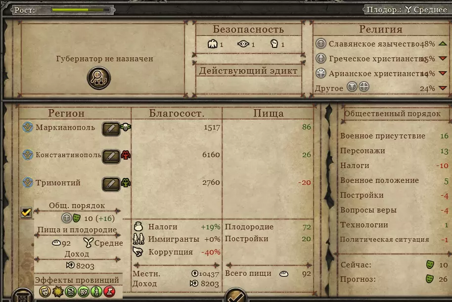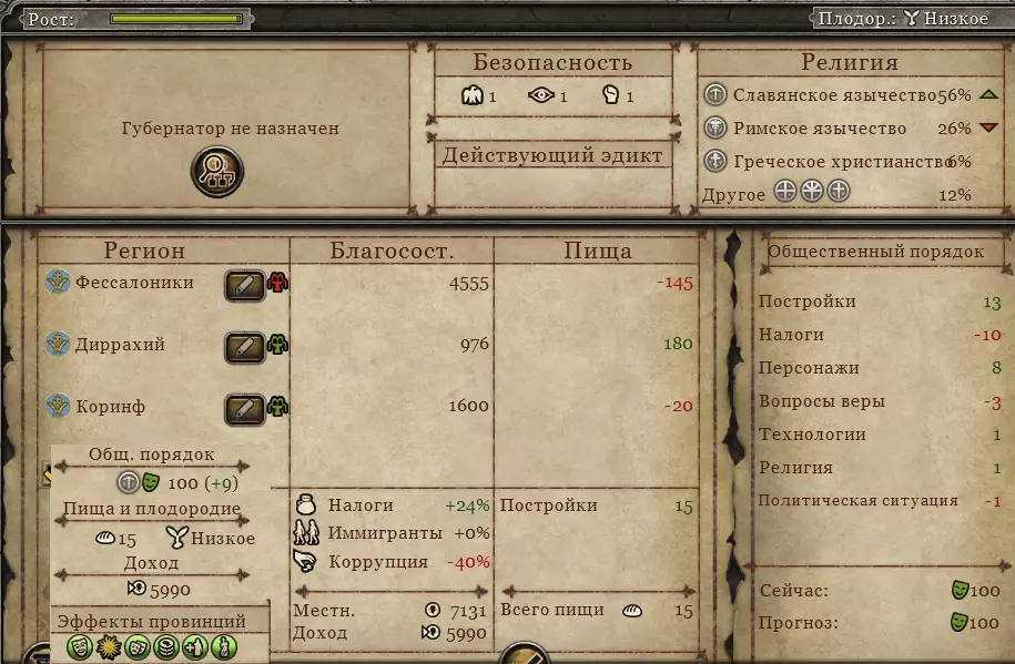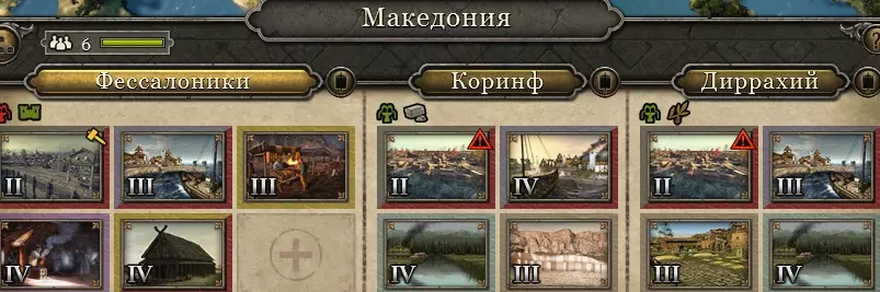 这里可以看出该省份部署了大量军队,但实际上只要它获得最后一个人口槽位,并在那里建造第二个公共用地槽位(+10食物,总计50食物),就能实现自给自足。当羊圈建成后,它的食物就刚好够用,还可以将城市等级降低一级。为达成此结果,需要总督具备以下条件:官员+6%区域税收,“首席宦官”+5%税收,祭司-文书+6%税收,祭司-“文书”+20%贸易建筑加成,侦察兵-“вастреш”+20%农业建筑加成,调查腐败-10%。目前总督法官等级为1级,似乎没有升级到2级的必要。不过有个想法是再派一个祭司过去——“经济祭司”,能为文化建筑提供+40%的加成。类似建筑:画廊。马其顿有3个港口和2个资源。