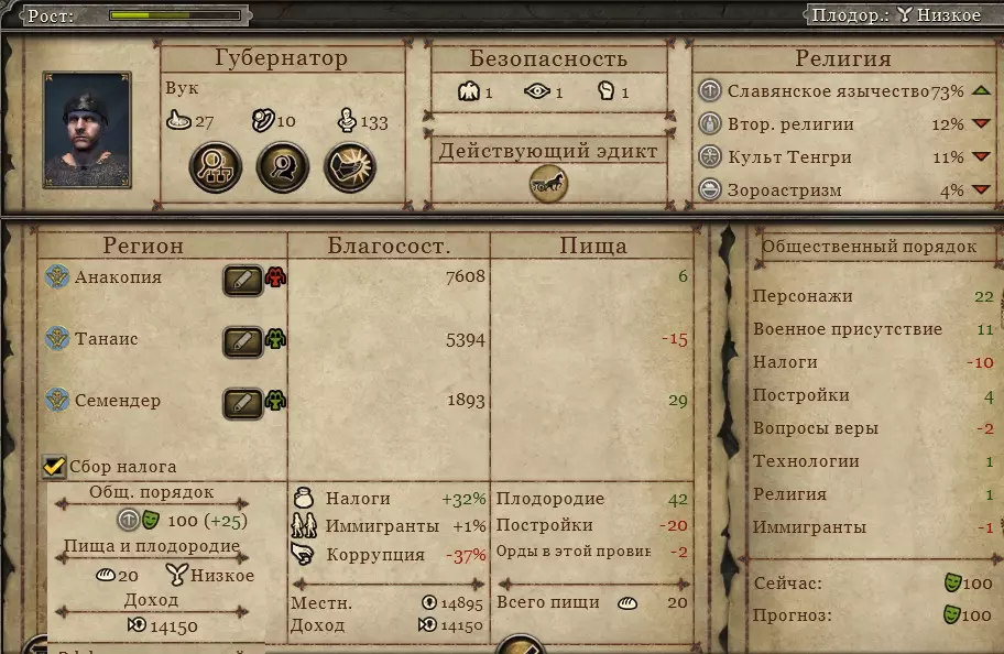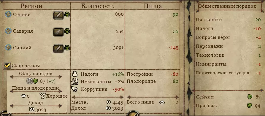 单独的建筑建造平衡计算,目前适用于【蛮族】。包含实用示例和说明。 属于大型指南的一部分。 数学基础 省份首府必建建筑列表: 城市/仓库(生态、食物)/公共用地(秩序)/公共用地-市场(金钱)。接下来的2个位置可能会根据地形发生变化,可能是:生产、资源、港口、食物、宗教。 省份(3个区域)内至少需要有3个食物来源且数值大于70(羊圈,中等的通常更好)——无论是来自资源、港口还是建造的食物建筑都可以。 羊圈4。最小值=70(+12)=82食物//谷仓3=70//82*2+70=234 这些食物仅用于维持秩序建筑的消耗,在税收-10的情况下,至少需要2个公共土地秩序建筑,1个在首都,1个在地区,共需150食物,对应19-27点秩序值,具体数值取决于选择。建议选择【科学+9】或【酒馆+17】,不要选择军事指挥官!军事指挥官仅适用于首都!也就是说:通常情况下,不能建造超过3座消耗食物的建筑,拥有【橄榄】的省份可能是例外,不过我自己还没尝试过。 此外,如果首都4级神庙能在该省份提供额外的祭司槽位并派驻祭司,那么可以用它来替代秩序类建筑。建议:1) 不建议斯拉夫人以及大多数其他民族在区域内建造神庙——这会占用一整个建筑槽位,而且神庙本身还会消耗食物,其带来的肥力加成也毫无用处,建造羊圈会更划算,因为羊圈的消耗本就极低。2) 对于大多数宗教而言,在首都神庙达到4级后,可以建造额外的祭司,这能提供大量的【信仰值】,甚至能与秩序类建筑相媲美。对于这类宗教,优先将首都神庙升级到4级至关重要,这在高难度游戏中很有帮助。 3) 同样不建议在区域将领袖建筑升级到3级以上,这纯粹是浪费粮食。只有在首都升级领袖建筑才有意义。4)不建议建造高等级城市——食物会被浪费——仅在边境城市面临攻击威胁时或有多余食物的情况下临时建造。城市等级需要好好平衡。如果建筑秩序不足,只需拆除1级即可。 5)对于斯拉夫人派系,若能叠加50%的折扣,城市等级可以免费升级:总督(带双鸦标识)20%、移民10%、建筑代理商20%。6) 建议尽快将省份的秩序等级提升至75以上,这样税收百分比会显著增加,且省份增长+6。 7) 建议优先夺取未完全建设的独立区域,并在这些区域投入最大的增长值——借助军队+8、总督迁移+10、公共秩序+75等效果,可实现+6增长等。对于有2个堆叠的单个区域,获得1单位增长总共需要15单位增长值。夏天的时候,我通过【军队】和【总督】在【发展度】和【移民】方面每回合能获得60+的收益——这还没算上【公共秩序】的加成——这样可以快速建造,并为相邻区域积累资源储备……如果你打算建造它们的话。如果想一次性占领所有区域,那么每个发展度单位就需要投入150+的资源。 8)不建议建造【渔业港口】(提供食物)——【贸易港口】更有利,还能促进道路发展。简单省份 在这个省份中不应有黄金或生产设施(它们需要大量秩序值——需要额外的秩序建筑来平衡,这意味着肯定无法建立宗教,食物也会不足)!但仍可以在首都建立宗教——食物刚好够用。 这个简易省份的建筑清单示例: 首都:城市/谷仓(生态食物)/营房(秩序)/市场(金钱)/宗教/食物