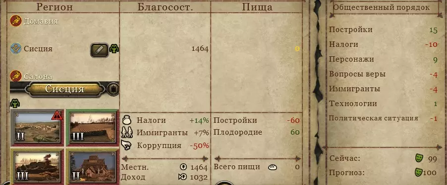 在萨瓦利亚,机甲提供70单位的食物。在剩余的省级区域城市槽位中,最好建造“扎德鲁加”,它几乎不会造成污染,能提供少量秩序,并且能为自身和相邻省份带来可观的收入。按照这种建造方式,甚至可以冒险在首都的最后一个槽位建造生产设施。单个区域 几乎不可能获得能带来收益的单个区域,就算它在没有税收的情况下不发生叛乱,你也该庆幸了。 为此,最好建造2座公共秩序建筑——它们可以不需要食物——在没有税收的情况下无需喂养它们,也不会有惩罚!关键是要将公共秩序提升到75以上,这样区域的发展速度会更快,也就意味着你能更快解锁所有槽位。