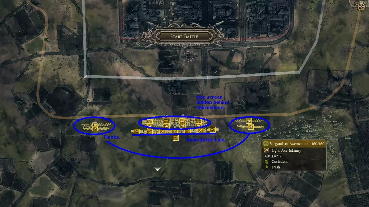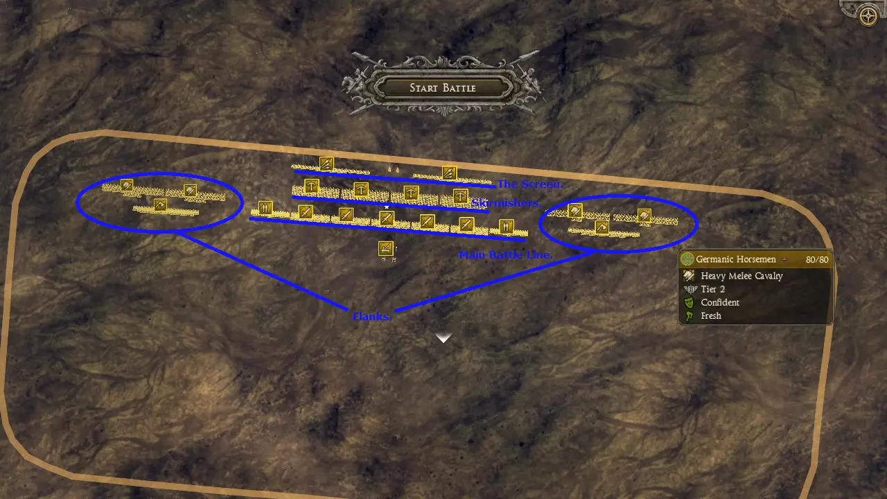 开阔地形示例 在本示例中,我使用高资金自定义战斗来模拟战役战斗。我扮演勃艮第人对抗西罗马帝国。我购买了在战役前50回合内可招募的单位。我选择西罗马帝国作为对手,因为在前50回合中,他们是大多数派系的常见攻击目标。为了使双方实力均衡,我为西罗马帝国配置了比战役中实际出现的更强的单位。 你会注意到我采用了常规的战役部队配置。根据个人偏好,我额外带了两支近战骑兵来加强侧翼力量。我还带了两支长矛单位部署在主战线的两端。这样一来,如果侧翼战斗失利,这些长矛单位可以转移到主战线前方形成掩护。