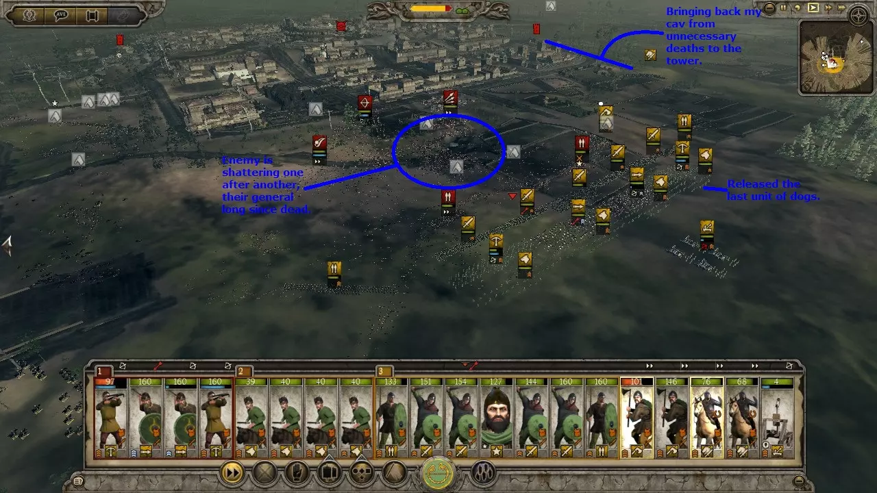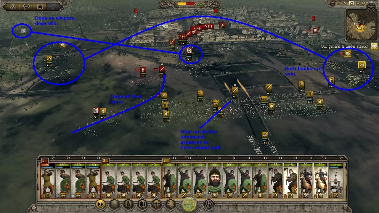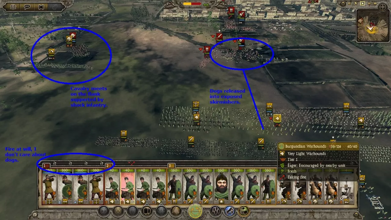 狗阵变体非常适合游戏初期,或是在对抗无城墙城市的攻城战中使用,前提是你拥有数量优势。敌人会被你暴露在外的散兵吸引。一旦可以释放战犬,就立刻释放它们。战犬会将敌人聚集起来,有效地将他们牵制在原地,同时你的散兵可以将其消灭。误伤战犬无关紧要,因为战犬免疫士气影响,并且每场战斗后都会重生。使用狗阵可以让你连续洗劫一座又一座城市,而无需因伤亡而休整。这算是一种取巧的战术,但非常有效。 需要注意的是,战犬能轻松击溃大多数散兵。 虽然图片上写的是“弩兵”,但任何散兵都可以使用。不过标枪兵和弩兵能迅速消灭敌方骑兵。战术:冲锋 骑兵对决: 强大的侧翼部队通常以骑兵为主力以保证速度。因此,侧翼战斗往往是骑兵之间的交锋。