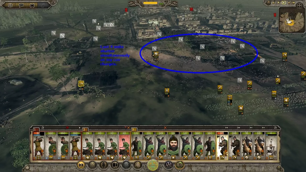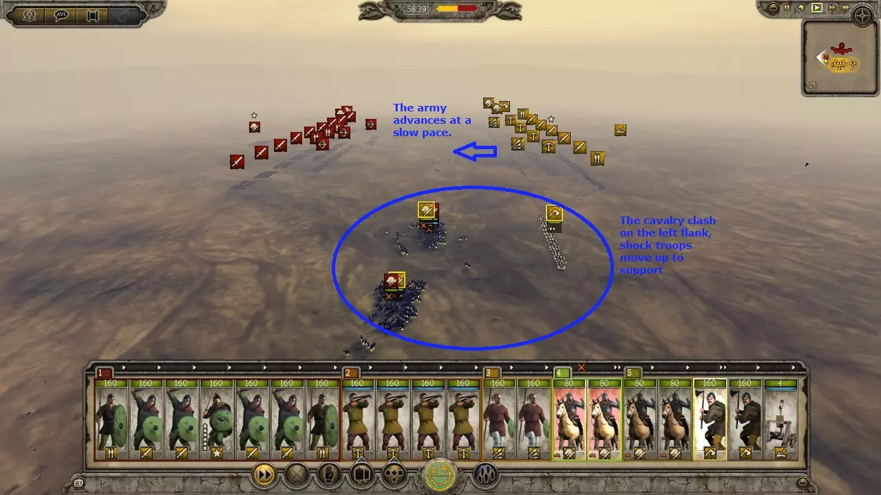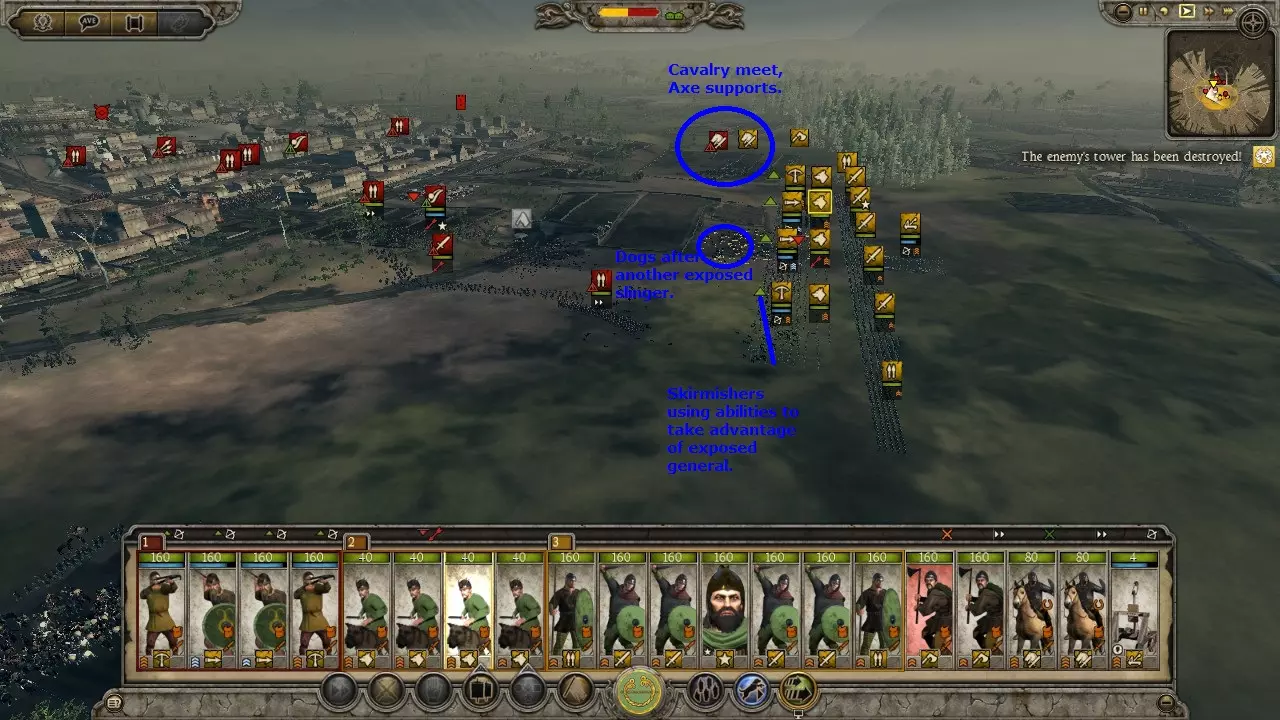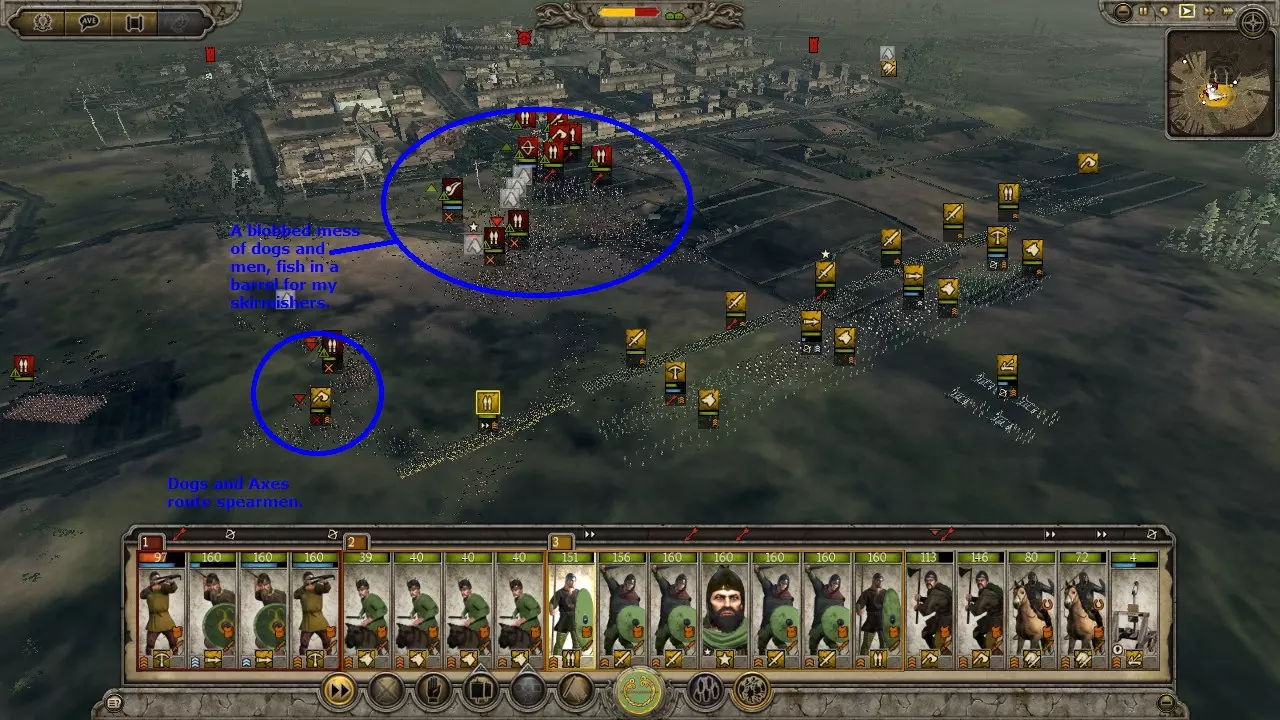 狗阵变体非常适合游戏初期,或是在对抗无城墙城市的攻城战中使用,前提是你拥有数量优势。敌人会被你暴露在外的散兵吸引。一旦可以释放战犬,就立刻释放它们。战犬会将敌人聚集起来,有效地将他们牵制在原地,同时你的散兵可以将其消灭。误伤战犬无关紧要,因为战犬免疫士气影响,并且每场战斗后都会重生。使用狗阵可以让你连续洗劫一座又一座城市,而无需因伤亡而休整。这算是一种取巧的战术,但非常有效。 需要注意的是,战犬能轻松击溃大多数散兵。 虽然图片上写的是“弩兵”,但任何散兵都可以使用。不过标枪兵和弩兵能迅速消灭敌方骑兵。战术:冲锋 骑兵对决: 强大的侧翼部队通常以骑兵为主力以保证速度。因此,侧翼战斗往往是骑兵之间的交锋。