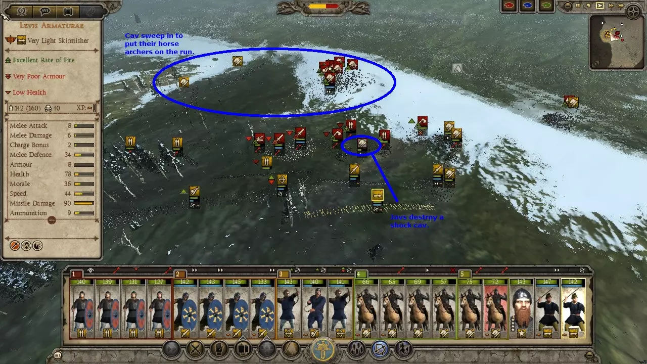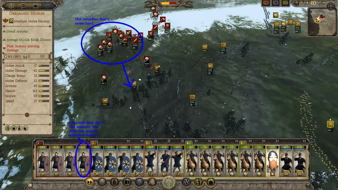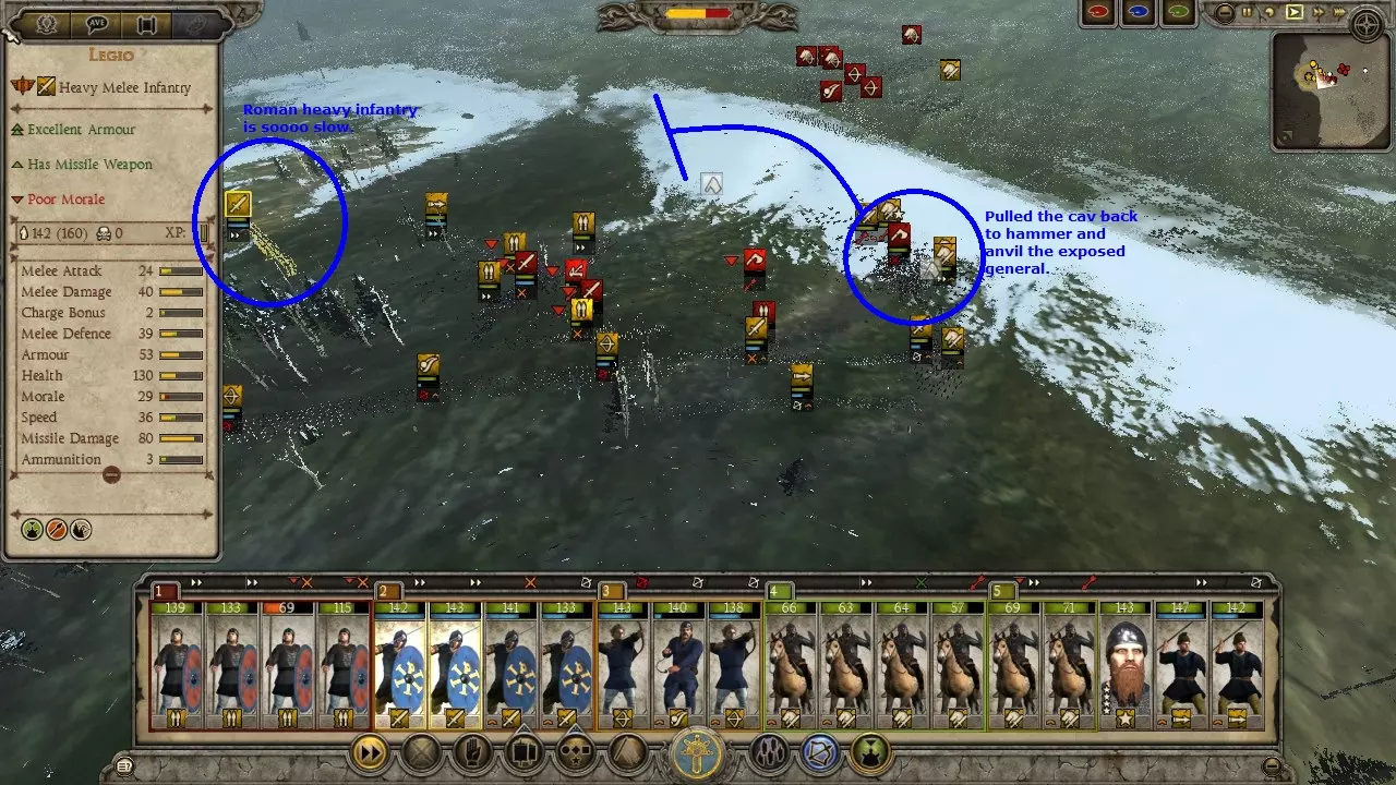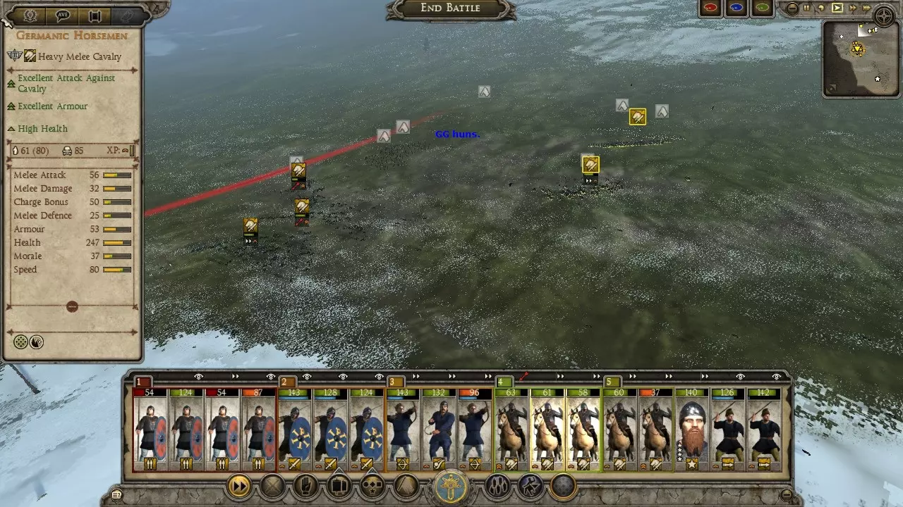 匈奴狩猎战例 这场战斗远不是我表现最好的一次,哈哈。我的军队并未针对狩猎匈奴进行优化,而且当时我正遭受冬季损耗的影响。另外,我开始截图的时间也有点晚,是在意识到这会是个不错的战例之后才开始的。 在这个战例中,我使用东哥特人进攻匈奴。通过一系列的撤退行动并利用河流,我成功将一支匈奴部队从五支部队组成的集群中孤立出来。当时正值冬季,我知道自己会遭受损耗,但还是发动了进攻,因为这是我获得单支部队作战机会的唯一途径。让我意外的是,他们竟然配备了弩炮。 这里面包含了让弩炮失效的方法、对散兵进行掩护的技巧,以及使用菱形骑兵阵形对抗冲击骑兵的战例。