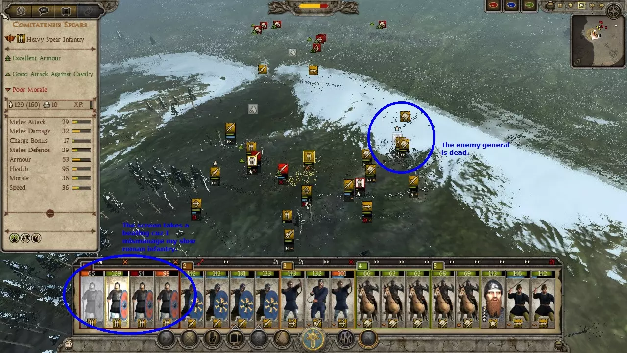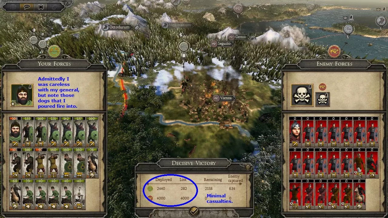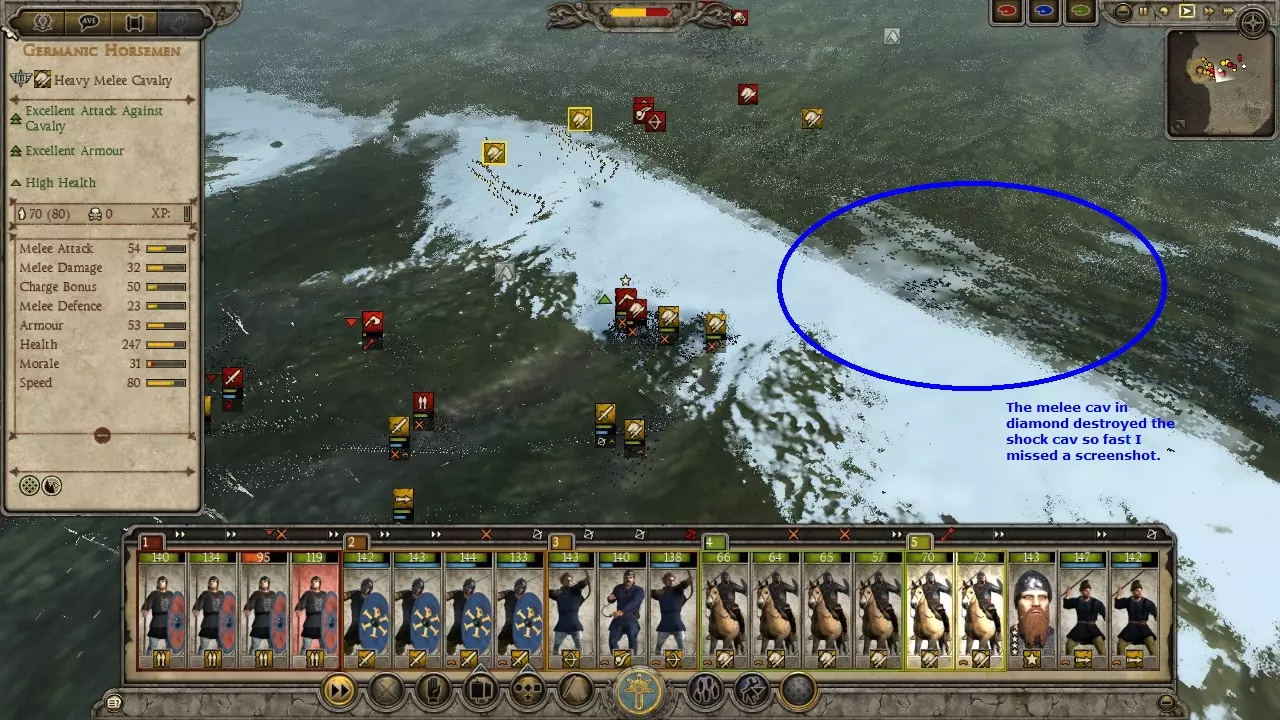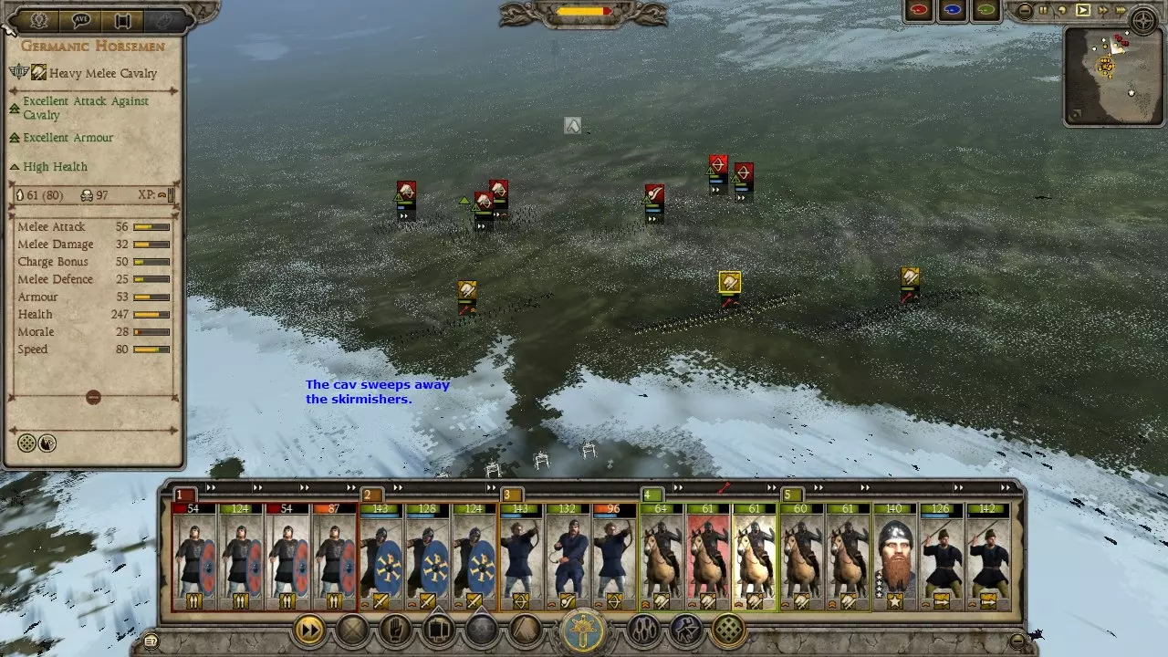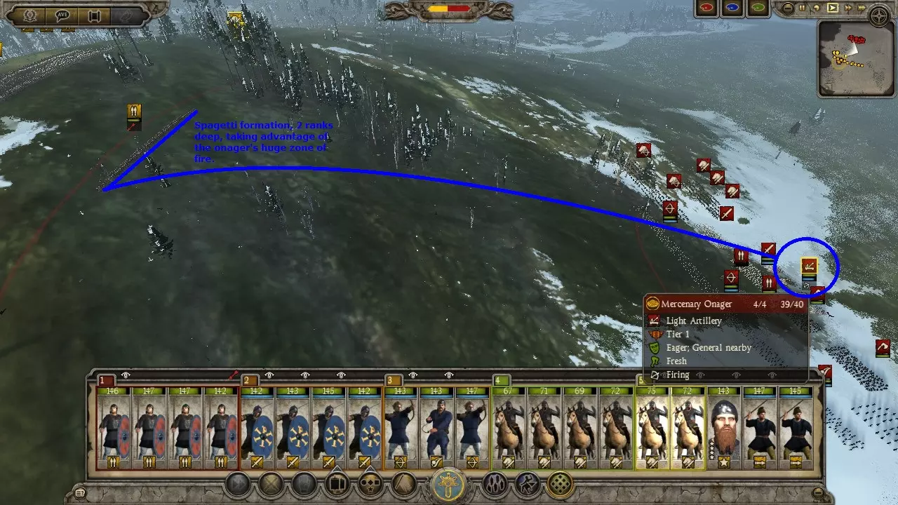 匈奴狩猎战例 这场战斗远不是我表现最好的一次,哈哈。我的军队并未针对狩猎匈奴进行优化,而且当时我正遭受冬季损耗的影响。另外,我开始截图的时间也有点晚,是在意识到这会是个不错的战例之后才开始的。 在这个战例中,我使用东哥特人进攻匈奴。通过一系列的撤退行动并利用河流,我成功将一支匈奴部队从五支部队组成的集群中孤立出来。当时正值冬季,我知道自己会遭受损耗,但还是发动了进攻,因为这是我获得单支部队作战机会的唯一途径。让我意外的是,他们竟然配备了弩炮。 这里面包含了让弩炮失效的方法、对散兵进行掩护的技巧,以及使用菱形骑兵阵形对抗冲击骑兵的战例。