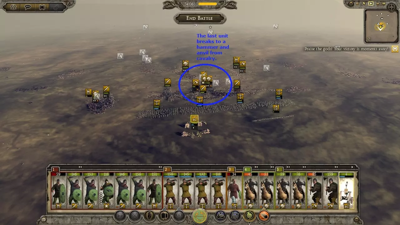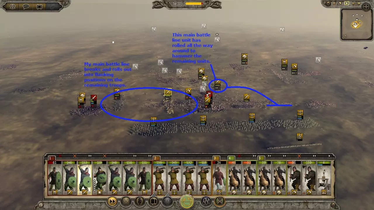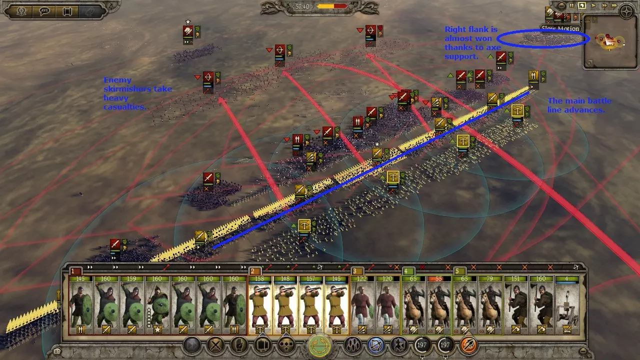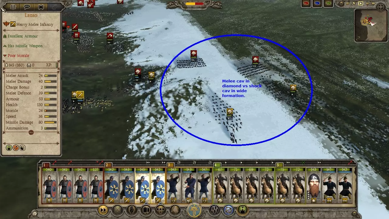 ### 军队组成、阵型与战术论述 #### 引言 本指南旨在帮助那些在战役战斗中遇到困难的玩家。内容涉及玩家对抗AI以及AI对各种情况的反应,不一定适用于当前多人游戏环境。 本指南将具体涵盖以下方面: - 军队组成:携带哪些单位进入战斗 - 阵型:如何排列所带单位 - 战术:如何运用单位与敌人交战 #### 军队组成 军队组成很大程度上取决于你可用的单位以及将要面对的敌人类型。不存在单一的“最佳”军队配置,很大程度上取决于个人偏好。不过,我会介绍一些基础知识。通用战役部队配置:此配置适用于攻城战以及对抗大多数派系的标准军队。它由一名将军和以下部队组成: 长矛兵或 pike 兵 x2:至少需要 2 队长矛兵或 pike 兵,以有效掩护你的主战线免受骑兵冲锋或吸收远程火力。这些部队将承受主要伤亡,在长期战役中通常会用廉价雇佣兵替换。 线列步兵 x4:这些部队将构成你的主战线,应由剑盾风格、具备良好近战防御和护甲的步兵组成。能够组成盾墙的部队在此位置表现出色,可帮助你在部署锤砧战术期间长时间维持稳固战线。冲击步兵x2:装备双手斧、镰状剑或其他具有高冲锋、高攻击和高武器伤害的单位。这些单位具有多用途,可帮助突破敌军阵线或在侧翼支援骑兵。 散兵x4:这些单位可承担多种任务,例如:削弱敌军主力阵线、消灭敌方散兵、纵火或击溃溃逃单位。 骑兵x2:可用于保护侧翼、摧毁炮兵、消灭散兵,以及通过锤砧战术突破敌军阵线。 炮兵x1:军队中至少需要一门炮兵,以进行攻城战,并在开阔地战斗中迫使敌人向你进攻。 偏好单位x4:根据个人喜好或所选派系的特点,为你的军队增添特色。反匈奴流派:此流派擅长应对匈奴等以大量骑兵和骑射单位为主的派系。配置包括一名将军及以下单位: - 4队长矛兵或 pike 兵:更多的反骑兵步兵能有效掩护己方。 - 2队线列步兵:通常足以抵挡该派系少量的步兵,也能聚集敌方骑兵并将其牵制。 - 4队散兵:这些单位是击杀骑射单位的关键,否则骑射单位会避开你的骑兵或长矛兵。 - 8队骑兵:以彼之道还施彼身,需携带大量强力近战骑兵来对抗该派系的冲击骑兵。采用菱形或楔形阵的近战骑兵能有效击杀冲击骑兵。炮兵×1:我发现带一队炮兵总是能迫使敌人主动向你进攻。 匈奴奶酪战术:让你的将军带领19支骑兵部队,用匈奴人的方式打败匈奴人。在战役模式中,这样做成本很高,但如果你负担得起,消灭匈奴就会变得轻而易举。 阵型 标准阵型