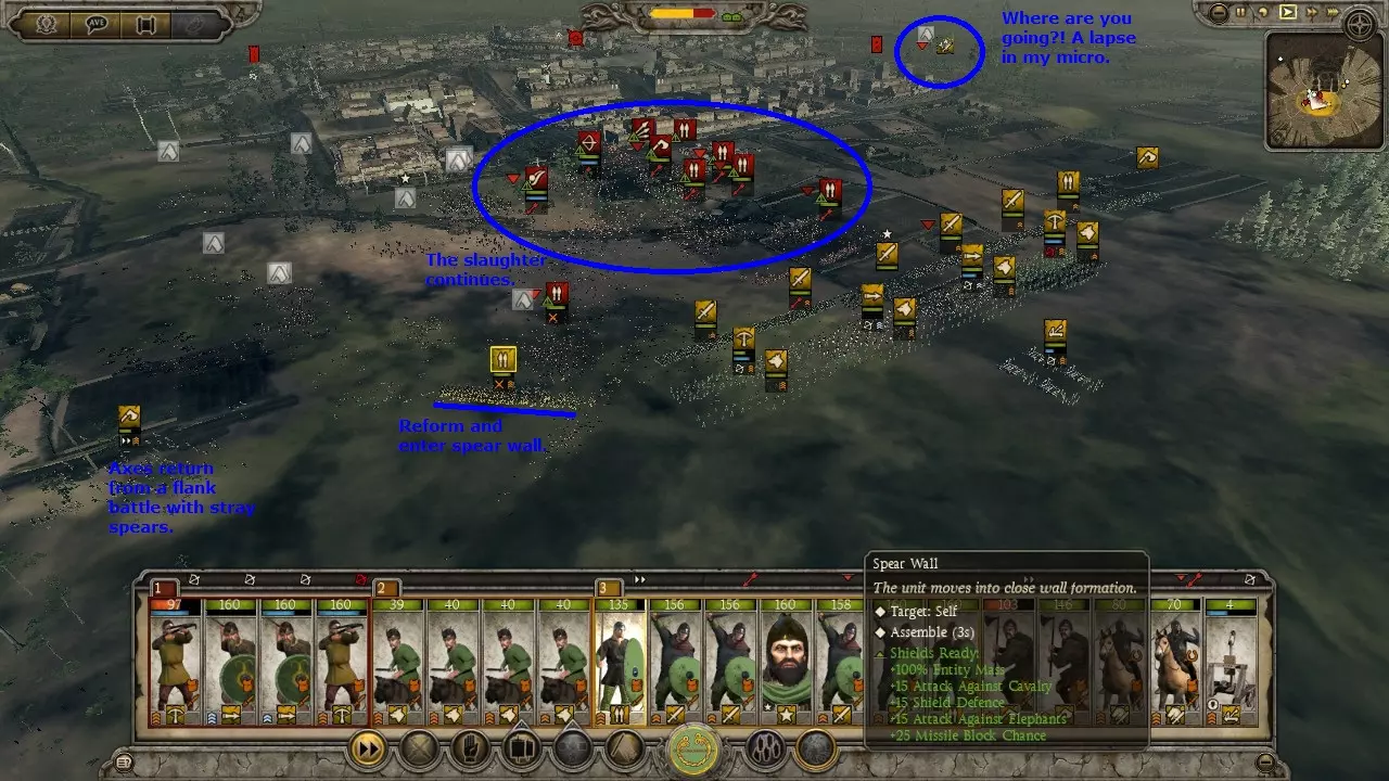 对抗AI骑兵时,如果骑兵试图包抄你的侧翼,让你的长矛或长枪单位跟随移动。AI会因此感到受挫并向你的防线发起冲锋,此时你需要组成长矛墙或方阵以发挥最大效果。 对抗散兵: