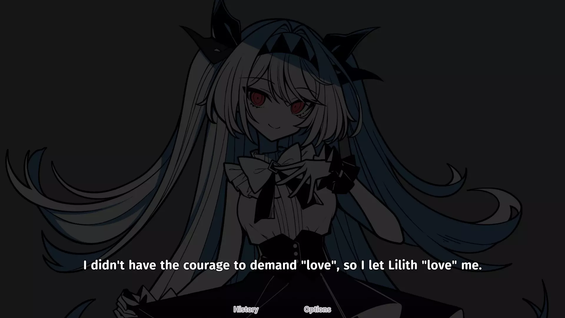 第██章:初次相遇 选择【我爱你】选项 第1章:甜蜜蛋糕时光: 蛋糕掉落之后,保持沉默(选择:【……】) 然后选择【这不是莉莉丝的错,都是我的错。】 接着再次选择【我没拿稳蛋糕……】以及【所以是我的错,全都是我的错,都是我的错,都是我的错……】 继续选择【都是我的错,都是我的错,都是我的错】,之后重复【都是我的错】……最后选择【……】(只有这一个选项),最后选择【-嗯,我明白了-】 然后选择【我很享受做蛋糕的过程……】 之后什么也不做,默默地开始清理