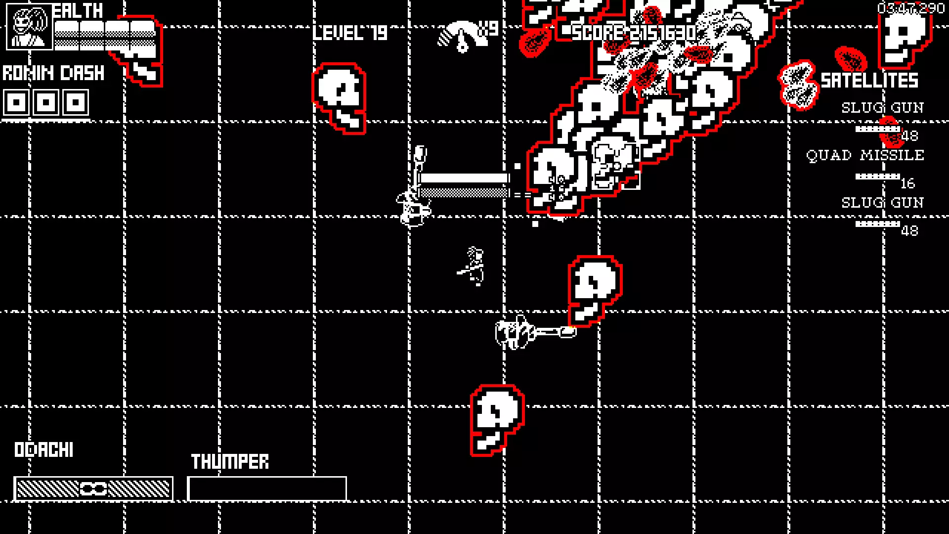击杀会掉落卫星的怪物,然后向任意方向开始奔跑(前半分钟到一分钟会比较艰难,但之后会明显变简单)。这个角色很有趣,因为他拥有吸血能力和高攻击速度,所以在整个游戏过程中我们要一直按住鼠标左键奔跑。我们的鼠标右键还有一个非常好用的技能,可以让我们冲向人群,从而同时恢复生命值和技能本身。沿途我们要尽量击退正面接近的怪物,控制好追逐我们的怪物群,不让它们靠得太近。偶尔我们可以切换方向。游戏中有一个非常烦人的怪物——它会发射大量红色波,而且速度相当快,并且有99。9%是导致游戏失败的主要原因,所以一旦它们出现就要立即消灭(如果它从人群中射击,我们就用技能冲进人群,干掉它,然后继续前进)。我们要保护好自己的卫星——在瘟疫医生出现时它们会派上用场。瘟疫医生大约在300万分时出现,通常会和蠕虫一起(不过并非总是如此)。要躲避医生的攻击(它经常会从远处向你发射一大串激光——立即飞出它的攻击范围,这极其致命)。集中攻击蠕虫,攻击它的头部,同时用技能治疗。蠕虫死后,就转向医生:等它传送,冲向它,使用卫星,同时用主攻击攻击它并抵挡骷髅。他应该在2-3次尝试内死亡,之后像之前一样继续跑。基本上,如果你的生命值较低,或者即将死亡,用鼠标右键的第二次攻击向人群释放(因为它是范围伤害),并处理任何靠近的敌人。就是这样。你可以通过让一个敌人同时掉落两个卫星来获得最终成就:要么你会很幸运,在刷分数成就的时候它就掉落了,你已经拿到了;要么你可以重新开始关卡,直到刷出两个卫星。人群示例: