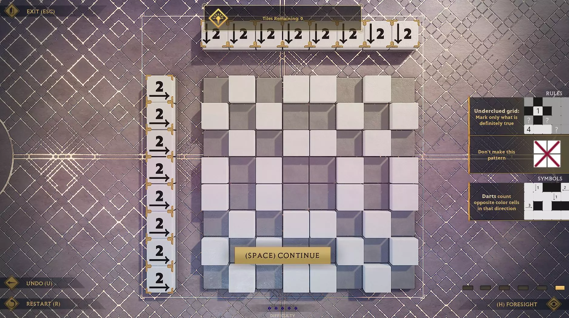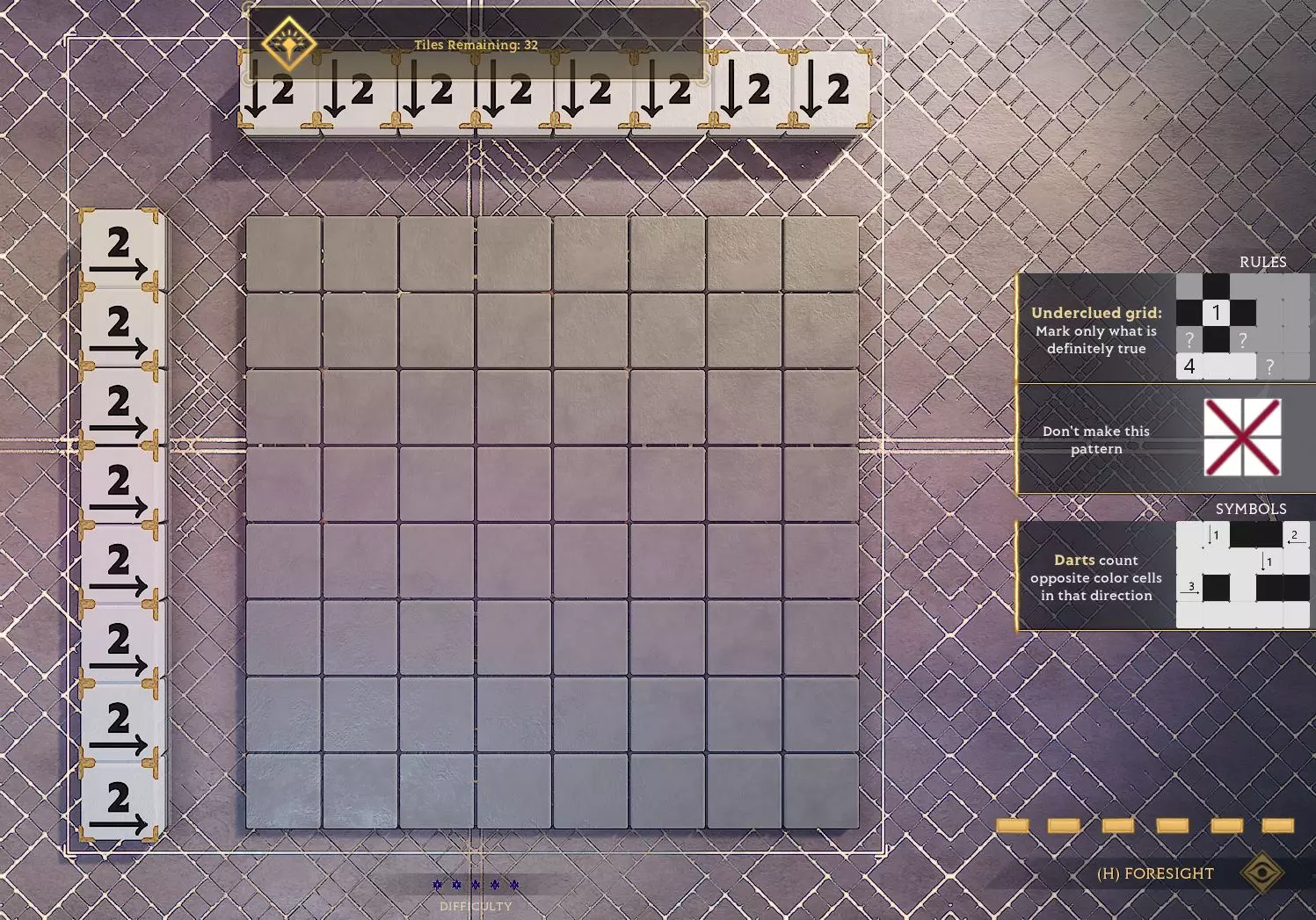 大家好。 我在所有讨论和攻略中都没找到这个谜题,而且我花了将近一个小时,在【预见】能力的帮助下才猜出来,所以我把它分享在这里。 我的统计学知识还不够好,没有【预见】能力的话根本猜不出这个规律。 希望大家玩得开心。 答案在截图的隐藏模式中,鼠标移过去就能显示。 这是空白的网格: 注意:你可能需要使用超级跳跃从下方进入这个谜题。