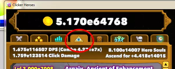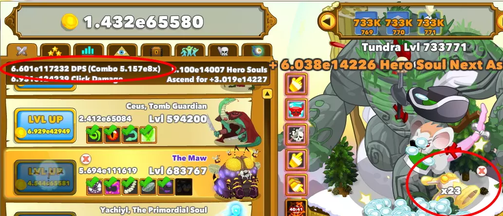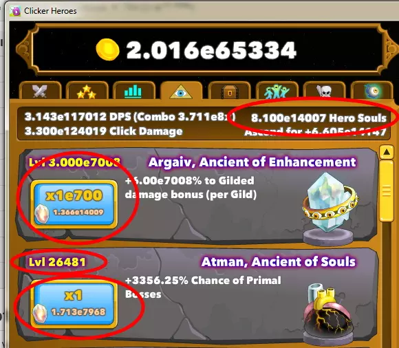 雷沃尔克:3.743(意味着点击飞鸟时有100%的几率获得2颗红宝石,而非1颗) 瓦古尔:1.440(意味着主动技能的冷却时间减少75%) 现在我该如何升级? 使用T键可以在升级英雄时切换x1/10/25/100/10000(显示为MAX)的倍数。升级远古时可切换x1/10/100/1000/10000的倍数。异界勇者只能逐个升级。 对于英雄,我在低等级时通常以100级为单位升级,之后则以10000级为单位。再之后,我只会借助自动点击器以x1的倍数升级当前英雄。 对于远古,我会根据当前拥有的英雄之魂(右上角)来决定升级。然后我按T键切换升级阶段,将远古者升级到其花费为[当前英雄之魂处于e^x-2]的状态——图中示例为e^14005(14007-2)。或者升级到达到效益极限为止(也可以略超过极限)。如果某次通关获得的英雄之魂超过e^200(通常在转生后或解锁英雄“巨口”后),我通常会按V键;点击远古者并一次性升级1e11111级。这样可以直接将其升到最大值,无需反复点击。当我对所有无上限的远古者都这样操作后,我会使用公会传承突袭的奖励来获取新的英雄之魂。我用这些将远古神灵重新调整为eMax-2模式。