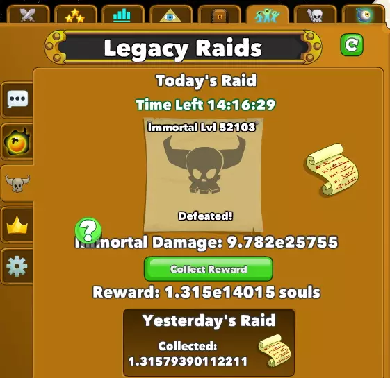 遗产突袭: 这仍是一种仅提供英雄之魂的旧模式,但我们当然会保留它。 我用它来在飞升后更快地升级我的远古英灵。稍后会详细说明。 激活你所有的自动点击器(这里不像不朽者那样限制为3个)。不要直接领取奖励。奖励在第二天仍然可用。