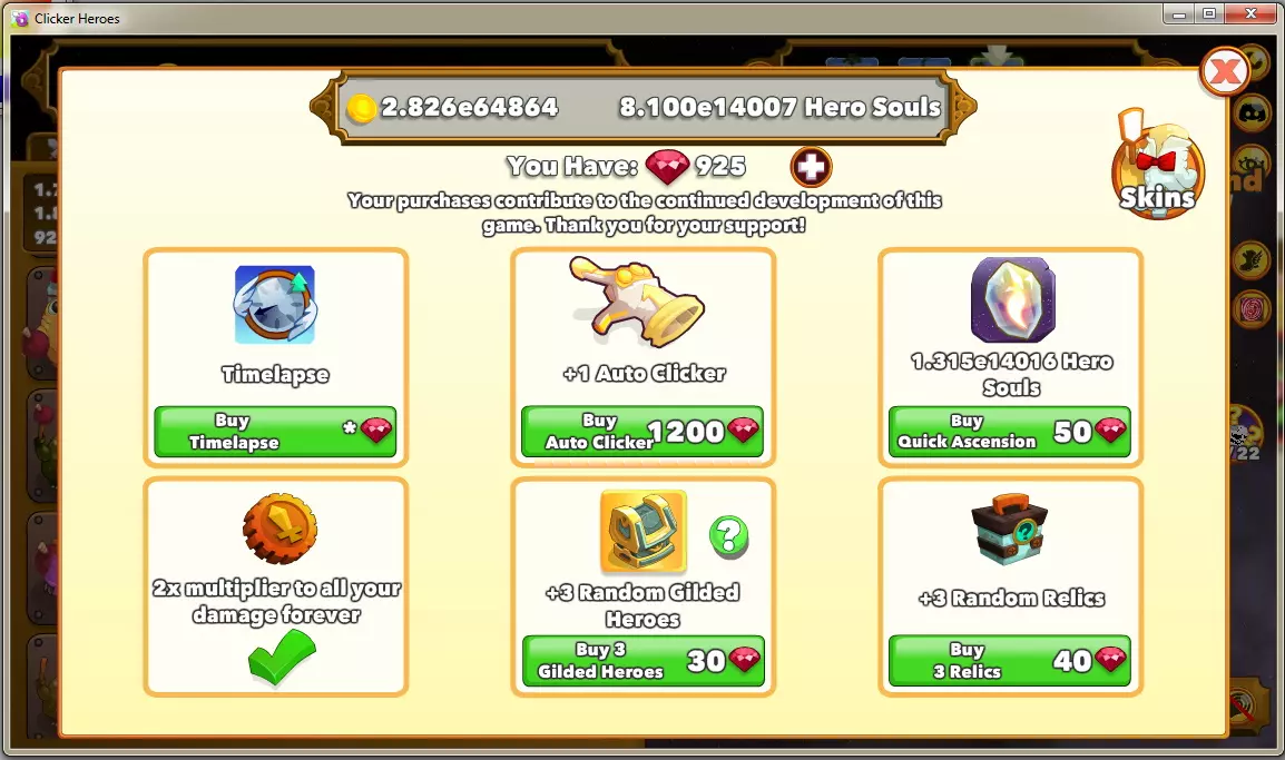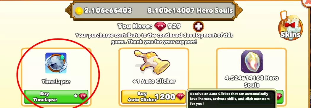 对于新手,我已在相应部分描述了如何进行优先级排序。这里只能逐个分配点数(建议先记下旧数值,并且暂时不要给Phandoryss分配任何点数!) 时间跳跃——购买哪些 当你刚完成一次飞升,分配好新获得的英雄之魂后,肯定不想再花费大量时间升级,直到能够提升等级上限。为此,商店中有可以用红宝石购买的时间跳跃道具。