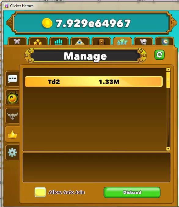 我不会经常购买镀金英雄,因为它们的实用性有限。 我不会购买随机圣物和快速飞升。随机圣物在下次转生后就会消失,相当于浪费了红宝石——尤其是这些圣物可能没有好的属性,甚至在下次转生之前都派不上用场。 快速飞升听起来不错,但只有在游戏后期才会显得有吸引力。然而,一旦你的等级超过1,000,000,它就会被限制。也就是说,超过1,000,000级的部分你不会获得英雄之魂——而这正是它本该发挥作用的时候。:( 关于时间流逝,我会在更高等级时再考虑。 公会 公会非常有用。在这里你可以赚取英雄之魂和红宝石。为此,你可以加入一个公会,或者花费50红宝石创建自己的公会。——我已经创建了自己的公会,本指南将重点围绕这一点展开。