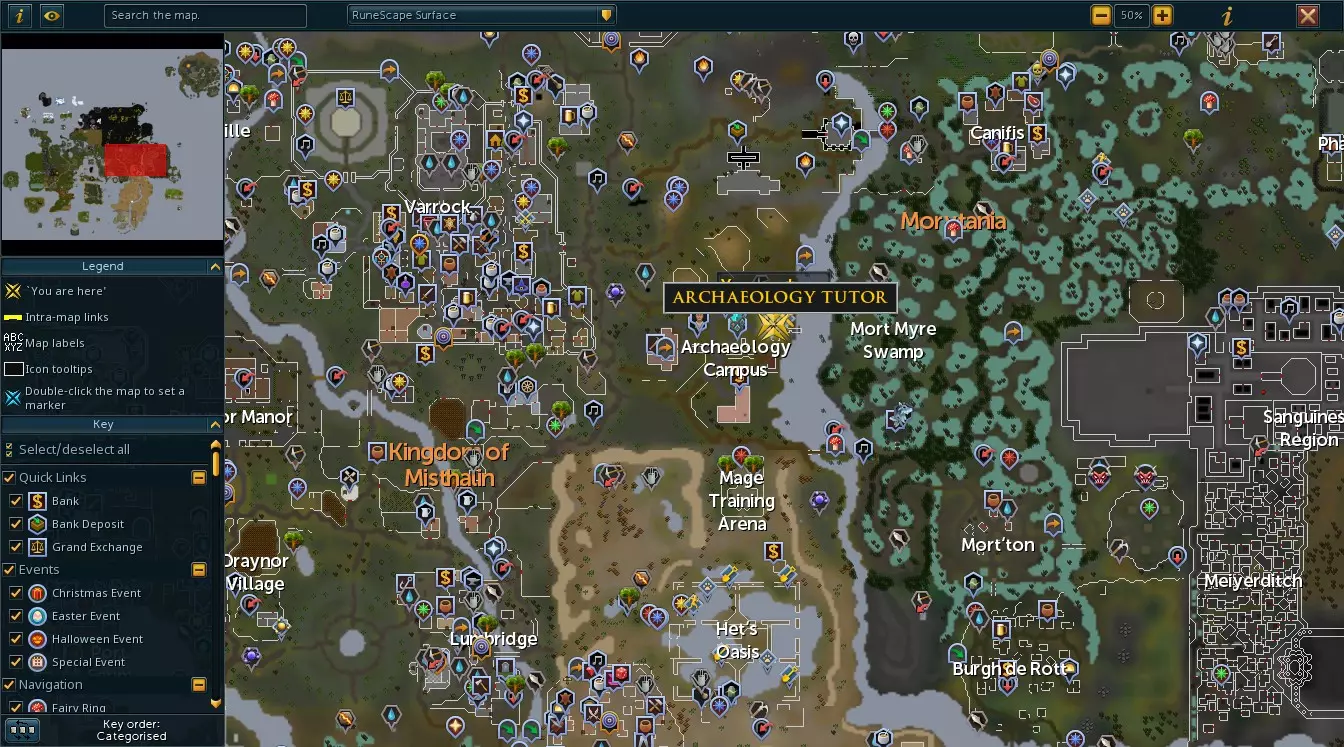 25 thieving required (Check previous section for thieving). Written guide for the quest. https://runescape.wiki/w/Creature_of_Fenkenstrain/Quick_guide Or if you prefer a video guide. https://www.youtube.com/watch?v=h5XC9lh7HQY 3. Then start the quest Garden of Tranquillity. 25 farming required (For a quick no effort farming method, shovelling manure at the Ardougne farm will get you to 25 in no time, video below). https://youtu.be/2uKpNdqpWS0 You do not need to complete this quest or have any of the required items to complete it, just 25 farming to start the quest and get an item needed for the Steam achievement. Simply progress through the quest up until you get the ring of Charos upgraded, this is in the first part of the quest.. Written guide for the quest. https://runescape.wiki/w/Garden_of_Tranquillity/Quick_guide Or if you prefer a video guide. https://youtu.be/3V3eKQJZoAE?si=LO2rCwF1t-FIycu_ Once you have the Ring of charos (a), head back to Gertrude in Varrock and request to choose the colour of your cat. You might need to retrieve your cat from your bank, drop it on the ground from your inventory and click on it and choose the option to shoo it away before Gertrude will let you have a new one, sorry if you where attached to it. : ( 7. Lumbridge Tasks Completing all Lumbridge tasks and claiming their rewards will grant 4 Steam achievements. You can use the wiki to track and tick off tasks as you go. https://runescape.wiki/w/Lumbridge_achievements Here is a quick video showing where you can find the Lumbridge achievements/tasks in game. https://youtu.be/bti0OpWI1XM You will need to reach certain levels in various skills for some of the requirements to complete all tasks. The levels needed to complete them are all shown below and the wiki will have a full list of items that are needed. You can visit the specific items wiki page to find out how to acquire them. Ill Briefly mention training methods for some of the skills. 20 Mining - Mine Common and uncommon gem rocks from the Al-Kharid mine. 40 Smithing - Go to an anvil after mining and craft an inventory full of highest tier gloves. 40 Fishing - Fish at spots around Lumbridge, buy a rod, bait and a cage from Lumbridge Fishing Shop. 50 Cooking - Cook the fish gathered from fishing. - Level 1-20 Raw Crayfish, fished from Burthorpe. - Level 20-50 Fly fishing from Lumbridge with Fishing Rod and Bait. 60 Firemaking You need to get 70 Woodcutting for a Lumbridge Task, so Burn/ add to bonfire, the logs you chop while you level up your Woodcutting. 50 Crafting - Mine common and uncommon gem rocks from the Al-Kharid mine and then cut the gems. (These are cut automatically and sent to your bank with the excavator relic which allows you to afk your way to level 50) 45 Prayer - Start doing the prayer Nexus and you can get this with no resource cost. At the entrance of the Lumbridge Swamp, claim the Charmed Sack from Ysondria. Fill it up by clicking in the middle of the nexus, when it is full go to one of the pillars around it to empty the sack, rinse and repeat until you have enough prayer. 59 Magic -Buy all of the magic armour and weapons from Betty in Port Sarim. Equip the higher tier gear as you reach the required levels. Use the Revolution bar recommendations from the wiki if needed. https://runescape.wiki/w/Revolution/Bars - level 1-10 Wizards robe, wizards staff. - Level 10-20 Imphide Robe, Imp horn wand, Imphide book. - Level 20-30 Spider Silk Robes, Spider wand, Spider orb. - Level 30-40 Batwing robes, Batwing wand and Batwing book - Further gear for magic will not be mentioned as it should be redundant with the xp multiplier and magic combat is not the focus on this guide. Fight these enemies - Level 1-30 Troll brutes in the cave behind the Burthorpe lodestone. - Levels 30-40 Zombies just north-east of the Wilderness lodestone. - Level 40-59 Fetid zombies outside of Fort Forinthry to the north (go to the Edgeville Lodestone and cross the wall into the Wilderness and run east towards the area). Alternatively, you can earn all of the magic xp needed by completing the quest Evil Dave's Big Day out, but it does require multiple other quests albeit early game ones to be completed beforehand, check under the requirements on the wiki page for more information. https://runescape.wiki/w/Evil_Dave%27s_Big_Day_Out/Quick_guide 57 Runecrafting - Do Runecrafting at the Runespan, this is Located in a portal at the top of the Wizards tower south of Draynor Village. (Use the Wicked Hood to instantly teleport there). - Runespan involves grabbing rune essence from the floating essence, then click on the nearby creatures or elemental nodes to turn that essence into Runespan runes. You can travel around to different islands by using the correct rune types to cross. When you are out of essence, grab more from the floating essence and repeat. Prioritise elemental nodes around the area as they give more xp than the creatures. Full details below. https://runescape.wiki/w/Runespan 70 Woodcutting As you level up your woodcutting skill, be sure to upgrade your woodcutting hatchet every 10 levels. Hatchets up to level 40 can be purchased from Bob's Axes in Lumbridge and then added to your Toolbet to replace your current axe. You can then buy a level 50 hatchet from Scavvo's Rune Store in the Champions' Guild near Varrock. Burn logs/ add to a current to clear inventory and level up Firemaking alongside this. - Levels 1-10 Normal trees found everywhere. (Bronze hatchet) - Levels 10-20 Oak trees can be found in lumbridge.(Iron hatchet) - Levels 20-30 Willow trees can be found in Lumbridge. (Steel hatchet) - Levels 30-40 Teak trees can be found west of Yanille or you can stay at willow trees till 40. (Mithril hatchet) - Levels 40-50 Maple trees can be found in Seer's Village. (Adamant hatchet) - Levels 50-70 Arcadia trees can be found north of Al Karid. (Rune hatchet) (It isn't needed but you can smith an Orikalkum hatchet for 60+ woodcutting, this will also require 