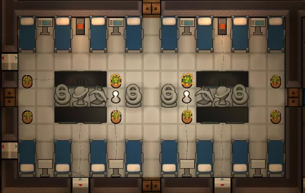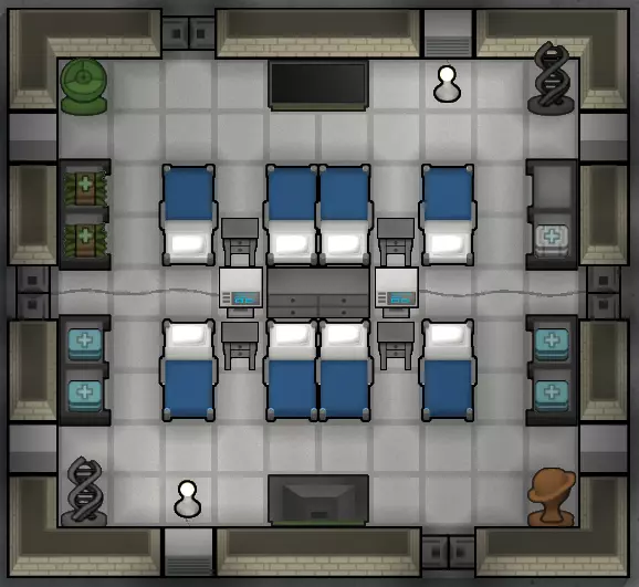 专用医院更像是游戏中期的设施,此时你已有足够资源建造医院所需的专用设备。医院病床能提升治疗质量、免疫力提升速度和愈合速度,这意味着殖民者能更快从疾病和伤痛中恢复,因此是医院的理想选择。生命体征监测仪能带来更好的治疗效果和免疫力提升,所以如果有的话,建议将其放置在医院病床附近。 医院应建在殖民者能迅速将倒下的同伴送去治疗的地方。保持门处于开启状态,或使用自动门,以免阻碍殖民者通行。如果需要,你可以在基地的其他地方建造更多医院。使用货架将药品存放在医院内或医院附近,这样医生就能快速取药为殖民者治疗,避免他们流血过多而死。有时候,这点距离就能决定生死。 医院的地板应使用无菌地砖,它们能提供轻微的清洁度加成,从而提高手术成功率并降低伤口感染几率。要记住,受伤的殖民者会大量出血,因此你可能需要指派另一名殖民者专门负责清洁医院,以提高治疗效果。 装饰医院使其美观可以极大地提升住院殖民者的心情(最高+15,还能增加房间的华丽度评分)。这很不错,尤其是考虑到有些殖民者会在医院待上一段时间,比如重伤、残疾或生病的人。 为了提供娱乐,你也可以在医院里安装电视。躺在电视观看范围内病床上的病人在感到无聊时会看电视来打发时间,这样你就不需要让其他殖民者来安慰他们作为唯一的娱乐来源了。 病人房间 如果你有更多资源,可以为每个殖民者建造单独的房间。虽然他们不介意和其他人一起睡在医院里,但他们确实会被其他人走动所打扰,而且灰尘也更容易影响清洁度。手术室 你可以建造一个独立房间来容纳将要接受手术的殖民者,确保殖民者在最洁净的环境中进行医疗手术。 你的手术室应始终设为禁止进入状态,除非有人即将进行手术。这能防止殖民者将灰尘或血迹带入,弄脏手术室。 兽医区域 考虑在药品储存区附近为动物设置专属的睡眠点和活动区域,并将受伤动物限制在该区域内。这样可以尽快对它们进行治疗。 动物的医疗处理同样受益于清洁度,但不需要专用病床(以及生命监测仪)。进入游戏中期后,无菌地板应该很容易获得。 豪华高效的医院布局