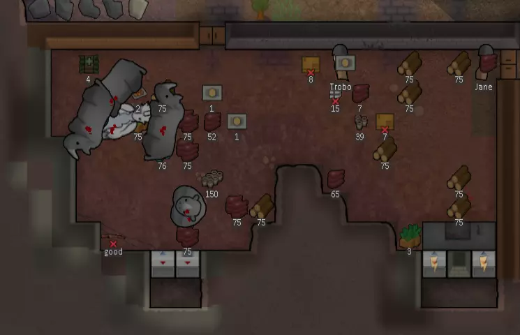 箭头指示物品通常的运输位置。房间大小不一定按比例绘制,此布局的多种变体都是合理的。【杀戮区】并非必需;采用此类布局时,也可以将敌人引诱至长廊,并从门口向其射击。【洁净室】应包含病床和厨房。 基地建筑 不同的建筑适用于殖民地的不同需求。地图生成时周围会有旧建筑,有时只是墙壁,有时是缺少部分区域的方形或矩形结构。如果位置便利,这些建筑完全可以作为起始点,大幅减少低技能角色的初始工作量,并减轻初期一无所有时的压力。存储 目前,我们需要建造的第一个房间是储藏室,因为物品如果放在室外或暴露在外会变质。设置一个储存区,覆盖房间的大部分区域,但要排除靠近门的地砖,因为有时殖民者可能会不小心把物品掉在门口,导致门无法关闭,造成安全隐患。你可以设置多个较小的储存区,并指定允许存放特定类型的物品,以便更好地组织它们。储藏室应建在靠近工坊的位置,以减少原材料的运输时间。 需要特别注意化学燃料或迫击炮弹等爆炸物,它们可能会爆炸并点燃你所有的库存。将它们分开放置在石制隔间中,并远离基地外部,以防止末日火箭筒击中物品,因为它们可以穿透墙壁。在此处放置一个灭火泡沫发生器,以防止火灾点燃弹药。 游戏中期,你可以添加轨道贸易信标,向贸易飞船出售物品。 营房是多个殖民者共享一个睡眠空间的房间。这在游戏初期很容易安置你的殖民者,但事实证明这很不方便,因为走动的殖民者会打扰其他居住者的睡眠,而且非恋人关系的殖民者不喜欢共享房间。床褥或床等家具可以提高他们的舒适度。家具越好,他们醒来的速度就越快,在日程安排中也会变得更有效率。在满足基本需求后,你应该升级殖民地,为殖民者提供私人卧室,同时可以将兵营改造成其他用途,比如医院或囚犯营房。 你可以通过放置雕塑、铺设美观的地板、安装温控设施以及摆放高品质家具(如梳妆台和床头柜)来为兵营添加正面心情加成,这些物品能同时提升多张床铺的舒适度。 殖民者喜欢在醒来后立即进食。初期你可以在兵营内放置桌椅,但条件允许时应将它们移到其他地方,因为进入兵营进食的殖民者会打扰其他人休息。在完成睡眠区建设后,应在兵营附近建造餐厅。 卧室